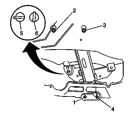 Rotate the cam (5) on the window regulator plate so that the slot (6) is straight up and down. In this position, the back of the glass will tilt forward.