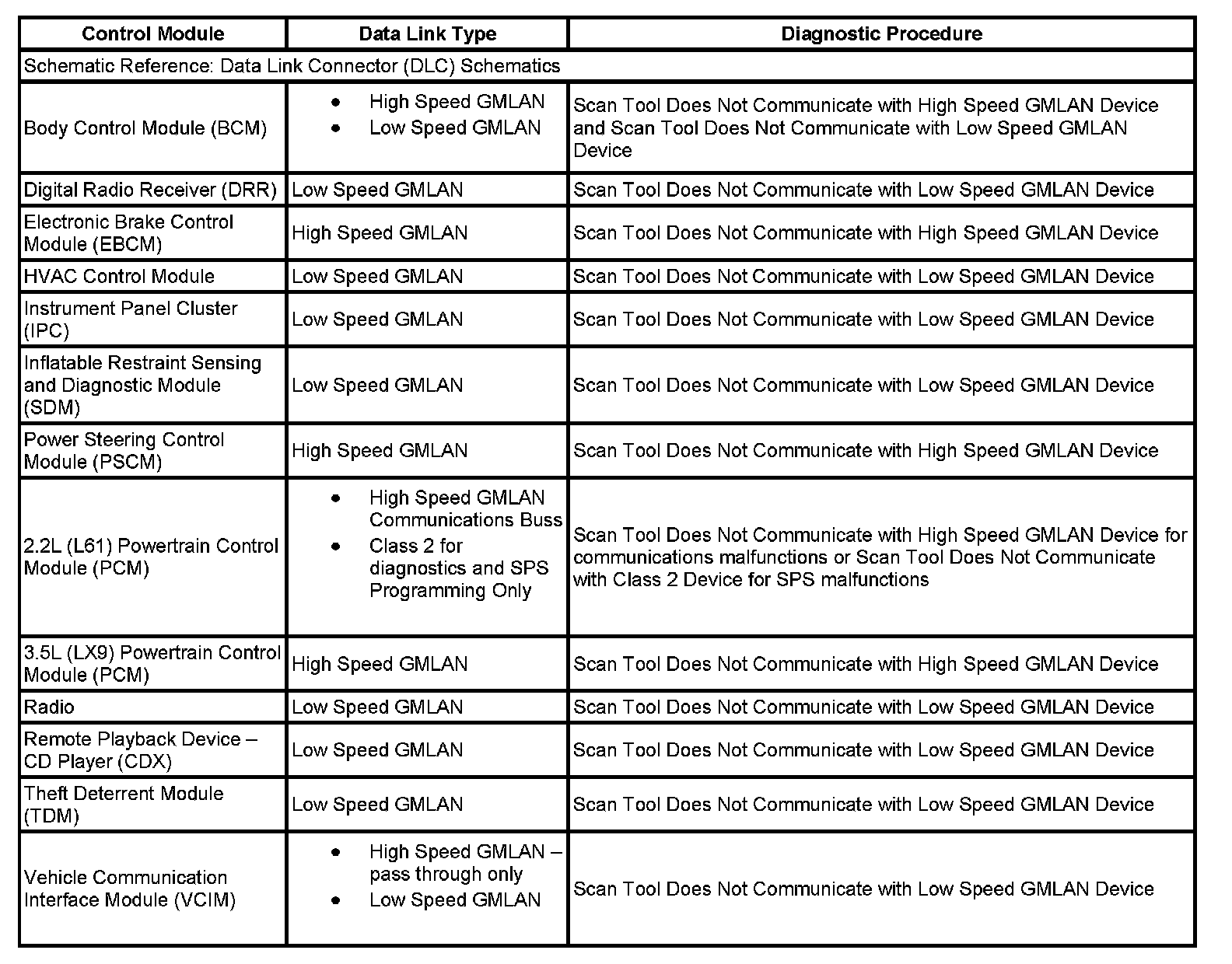This table identifies which serial data link that a particular module uses for in-vehicle data transmission. Some modules may use more than one data link to communicate. Some modules may have multiple communication circuits passing through them without actively communicating on that data link. This table is used to assist in correcting a communication malfunction. For the description and operation of these serial data communication circuits, refer to Data Link Communications Description and Operation.