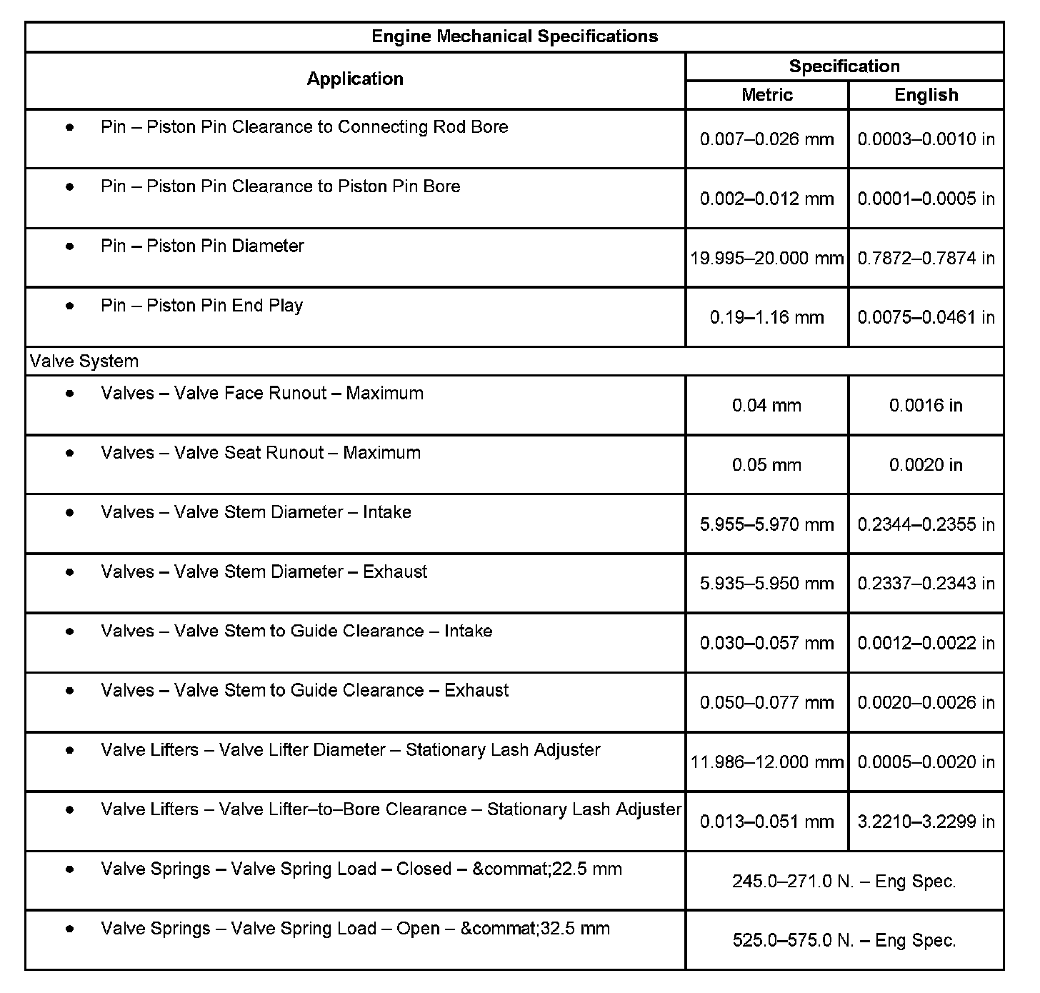 Engine Mechanical Specifications