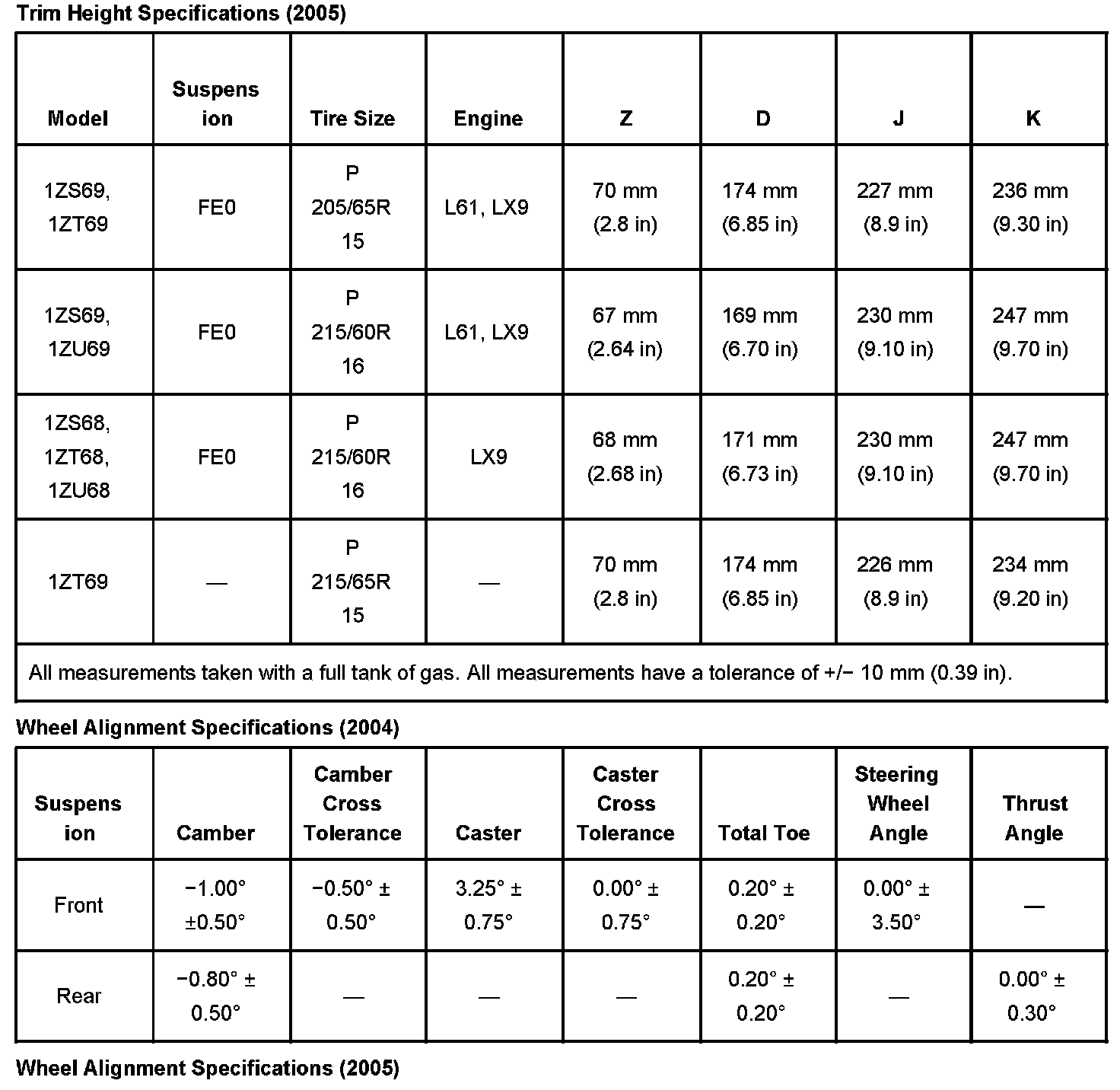 This bulletin is being issued to revise the Trim Height Specifications (for 2005) and the Wheel Alignment Specifications (for 2004 and 2005) in the Wheel Alignment sub-section of the Service Manual. Please replace the current information in the Service Manual with the information shown.