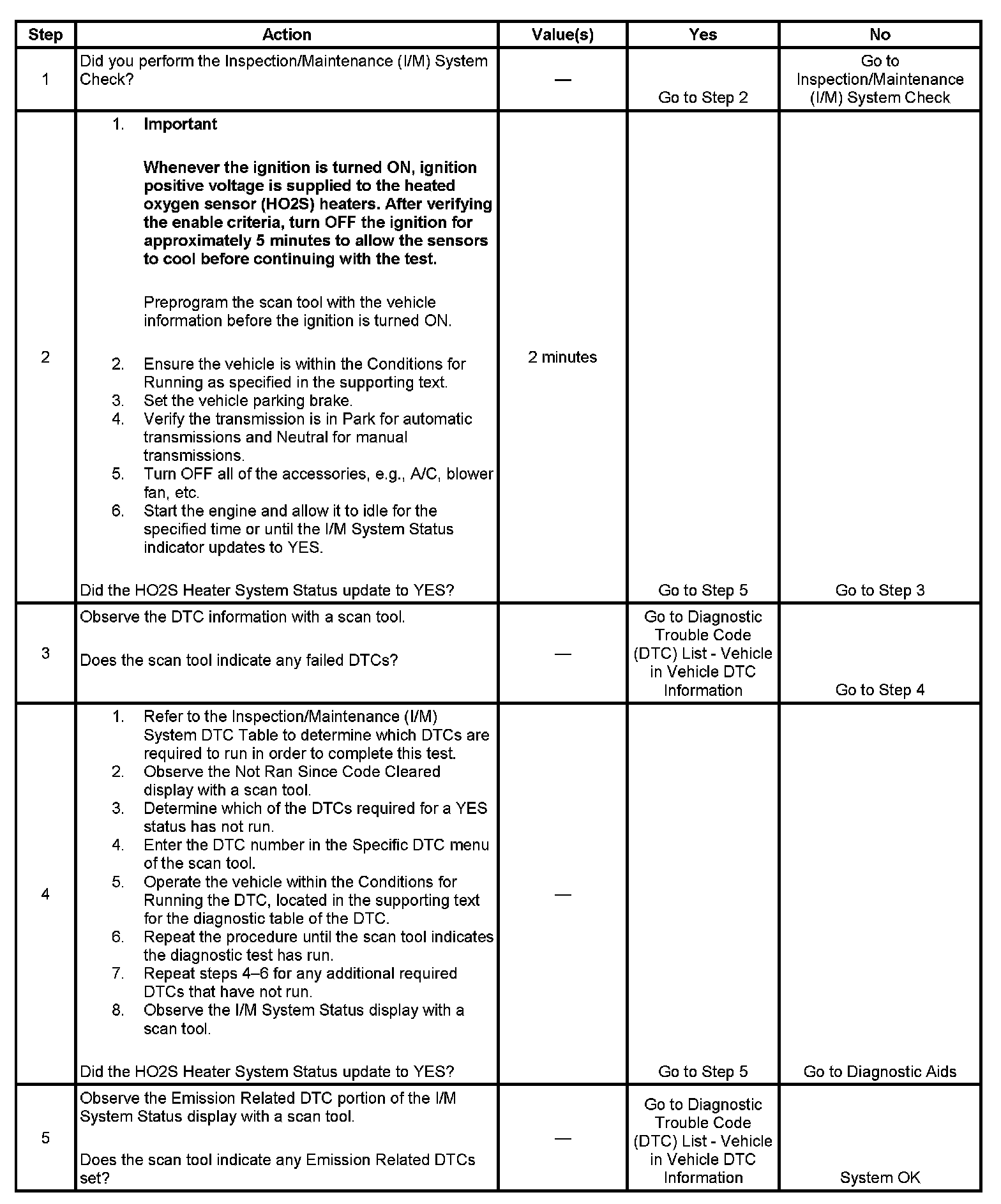 The purpose of this test is to satisfy the enable criteria necessary to execute inspection/maintenance (I/M) readiness diagnostics for the heated oxygen sensor (HO2S) system. The test may be used to set the I/M System Status to YES. The I/M System Status display on the scan tool provides an indication of whether the control module has completed the required tests. The I/M System Status does not indicate that the tests have passed or failed. When all of the diagnostics for a specific system have run and passed, the I/M System Status will update to YES. If a test for a specific system has failed, the I/M System Status will update to YES, indicating a determination was made, even if all of the other tests for that system have not run.