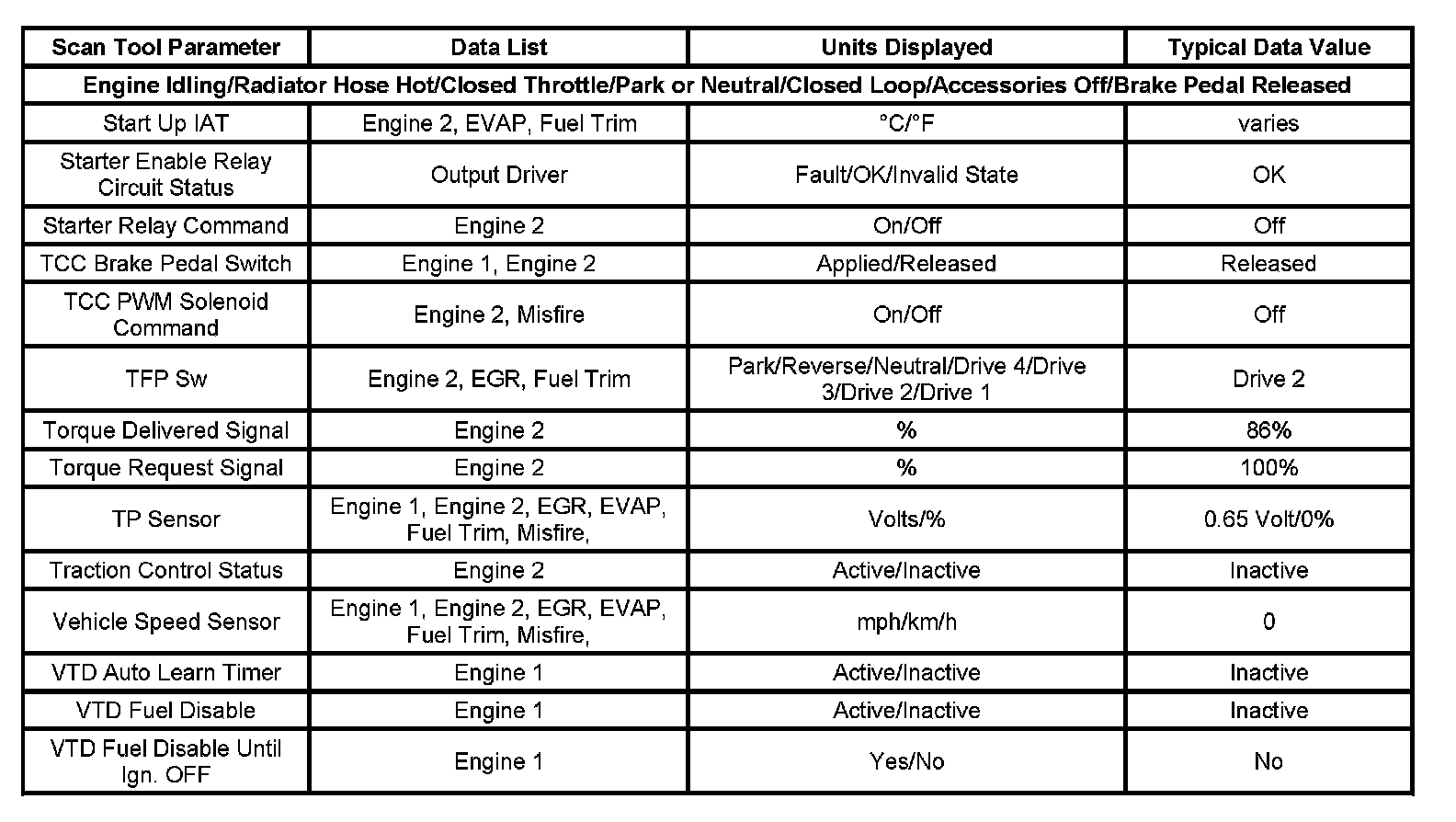 Use the Typical Scan Data Values table only after the Diagnostic System Check-Computers and Control Systems has been completed, no DTCs were noted and you have determined the on-board diagnostics are functioning properly. Scan tool values from a properly running engine may be used for comparison with the engine you are diagnosing. The Typical Scan Data values represent values that would be seen on a normally running engine.