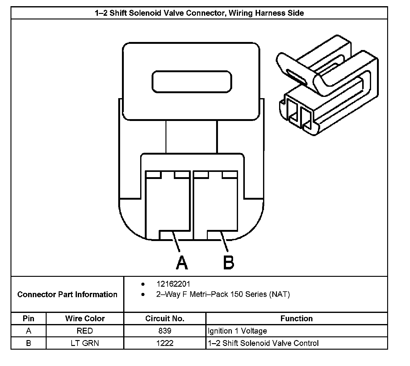 1-2 Shift Solenoid Valve Connector End View, Wiring Harness Side:
