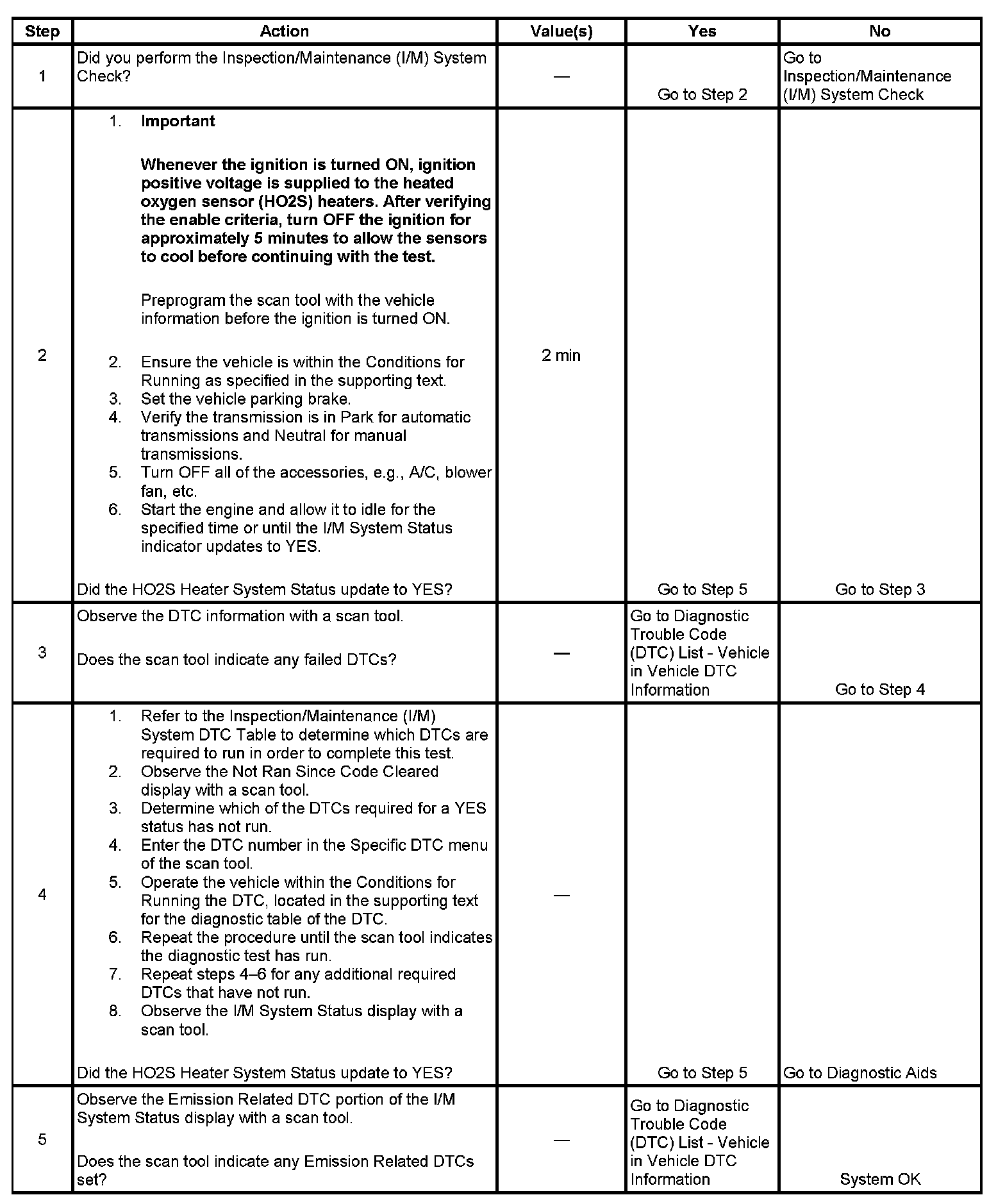 The purpose of this test is to satisfy the enable criteria necessary to execute inspection/maintenance (I/M) readiness diagnostics for the heated oxygen sensor (HO2S) system. The test may be used to set the I/M System Status to YES. The I/M System Status display on the scan tool provides an indication of whether the control module has completed the required tests. The I/M System Status does not indicate that the tests have passed or failed. When all of the diagnostics for a specific system have run and passed, the I/M System Status will update to YES. If a test for a specific system has failed, the I/M System Status will update to YES, indicating a determination was made, even if all of the other tests for that system have not run.