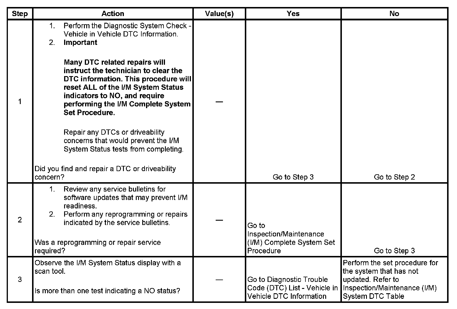 For the specific DTCs required for each system, refer to Inspection/Maintenance (I/M) System DTC Table. Systems such as fuel delivery, misfire, and comprehensive components may not be listed in a system status list. These tests run continuously and do not require an I/M System Status indicator. Inspection/Maitenance (I/M) System (DTC) Table