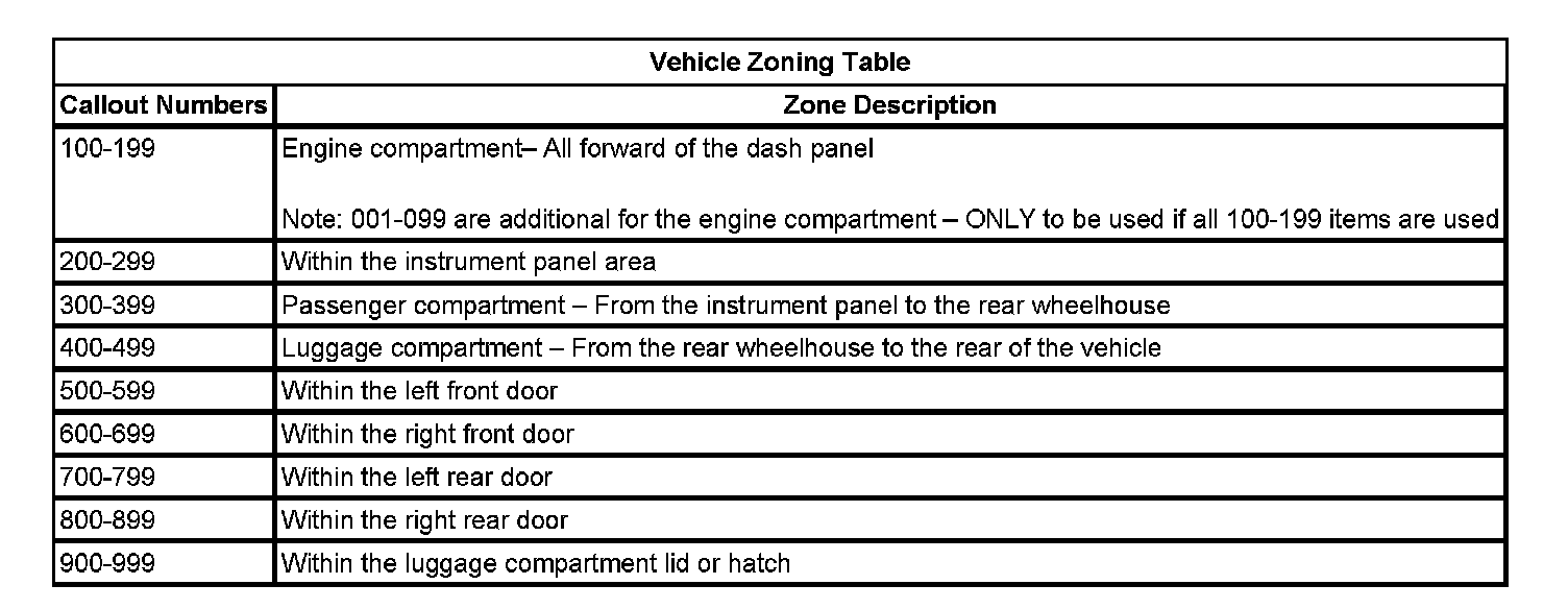 All grounds, in-line connectors, pass-through grommets, and splices have identifying numbers that correspond to where they are located in the vehicle. The table explains the numbering system.
