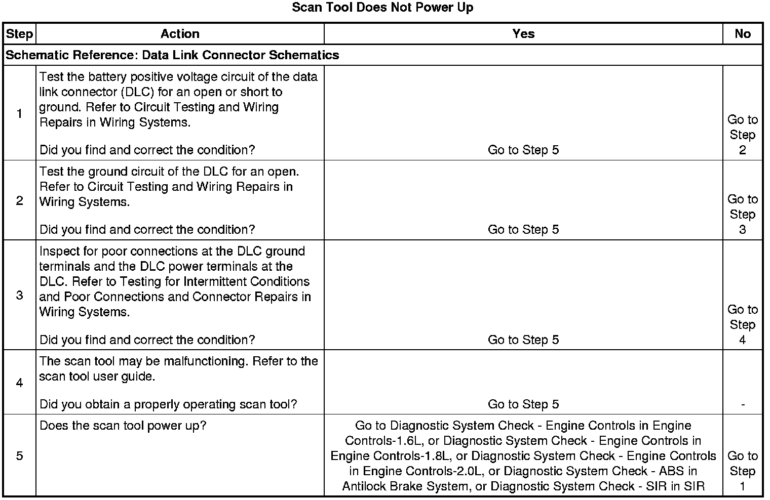 The data link connector (DLC) provides operating power for the scan tool at terminal 16. The ground for the scan tool is provided at terminal 4. The 16 pin DLC provides the serial data signals at terminal 7 - ECM, TCM, terminal 3 - speed sensitive power steering, terminal 12 - EBCM, and terminal 13 - SIR serial data. The scan tool will power up with the ignition OFF. The ignition must be ON in order for the scan tool to communicate with a control module.