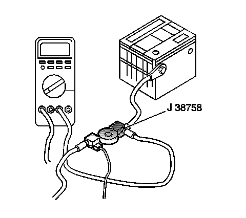 3. Install the J 38758 Parasitic Draw Test Tool between the negative battery cable and the negative battery terminal.