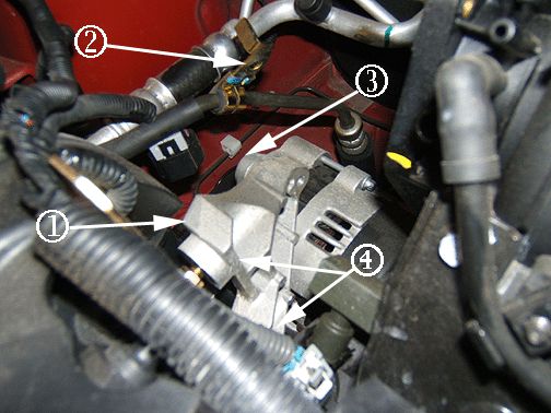 3. Remove the two nuts/washers holding the generator shackle bracket to the engine (4).