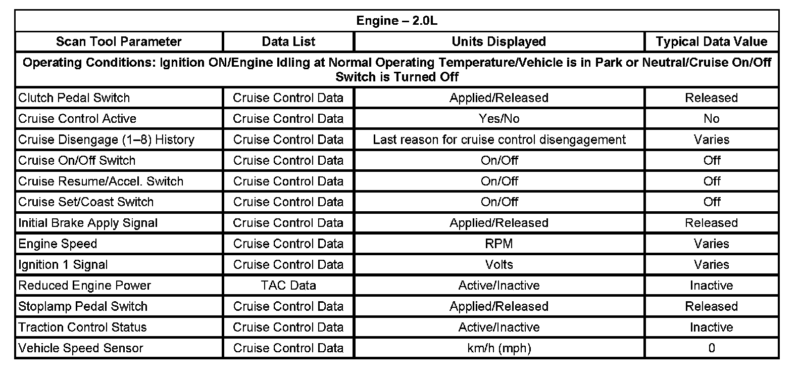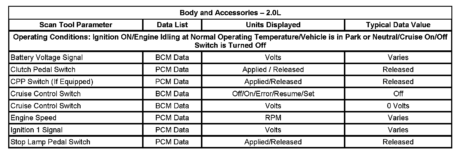 The scan tool data lists contain all of the cruise control related parameters that are available on the scan tool. The parameters in the list are arranged in alphabetical order. The data list column indicates the location of the parameter within the scan tool menu selections.