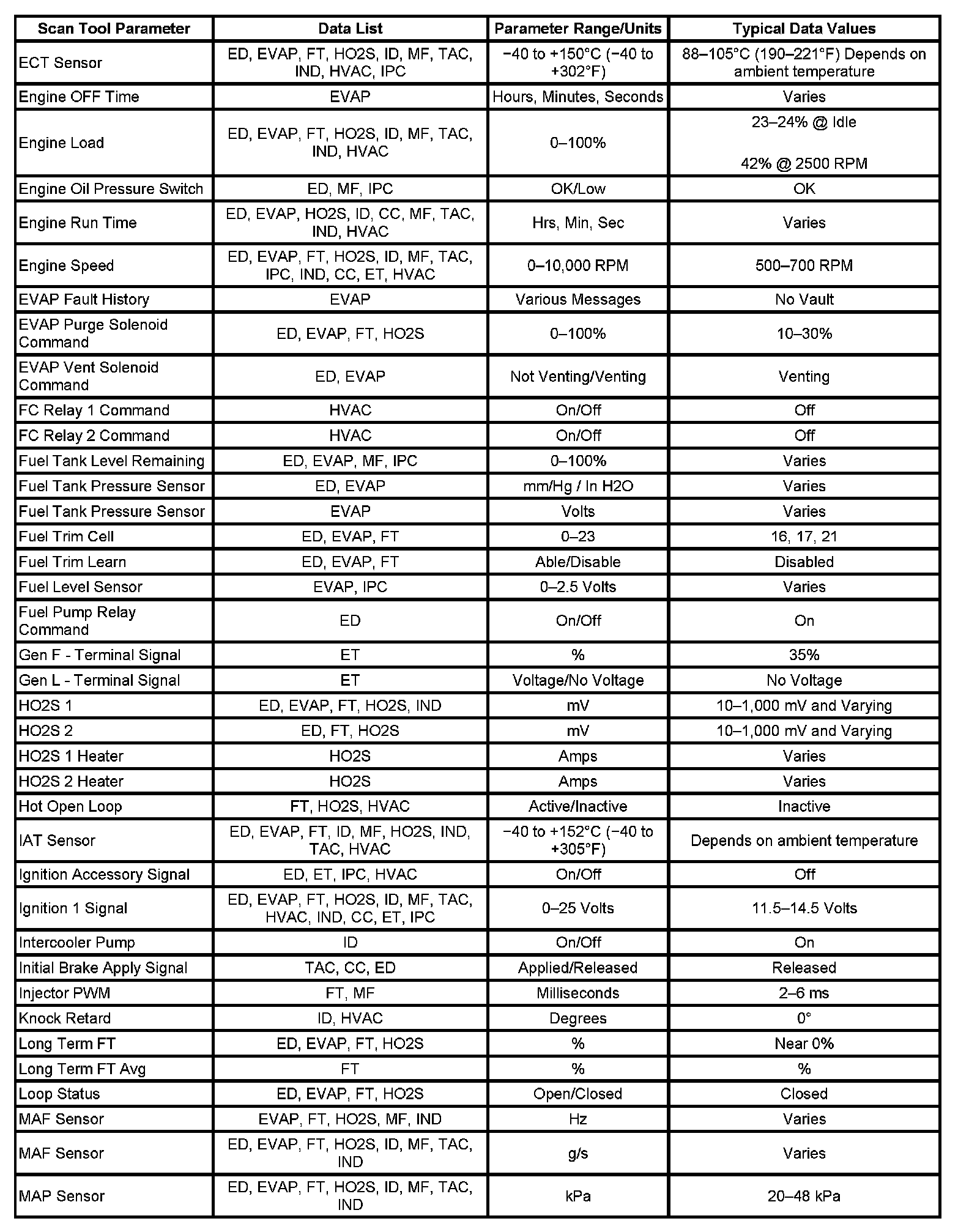 The column labeled Data List indicates where a parameter can be located on the scan tool. Refer to the scan tool operating manual for the exact locations of the data lists. The following is a description of each term listed: