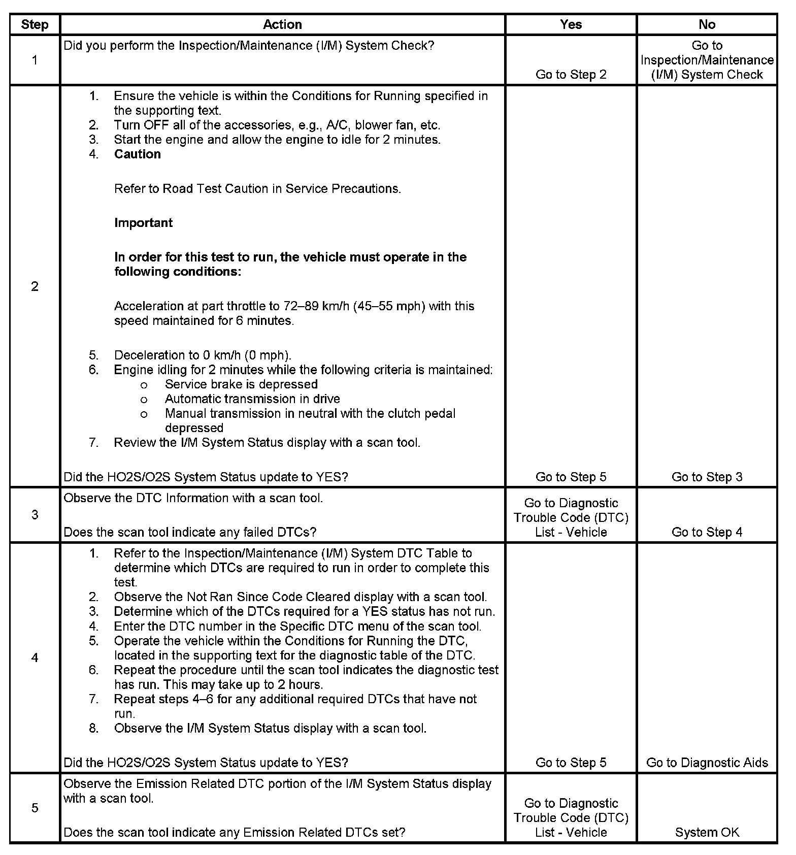 The purpose of this test is to satisfy the enable criteria necessary to execute inspection and maintenance (I/M) readiness diagnostics for the oxygen sensor/heated oxygen sensor (O2S/HO2S) system. The test may be used to set the I/M System Status to YES. The I/M System Status Display on the scan tool provides an indication of whether the control module has completed the required tests. The I/M System Status does not indicate that the tests have passed or failed. When all of the diagnostics for a specific system have run and passed the I/M System Status will update to YES. If a test for a specific system has failed, the I/M System Status will update to YES, indicating a determination was made, even if all of the other tests for that system have not run.