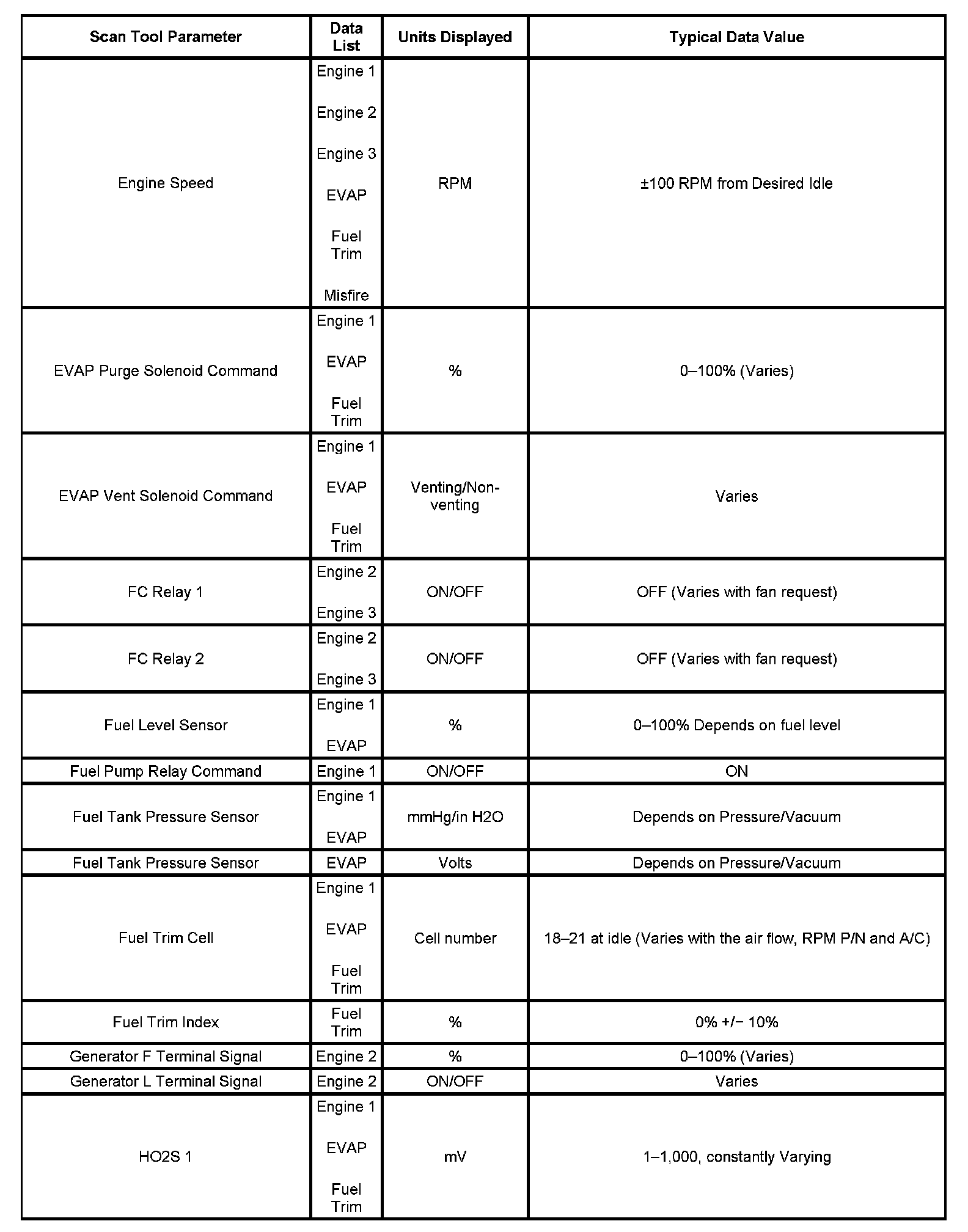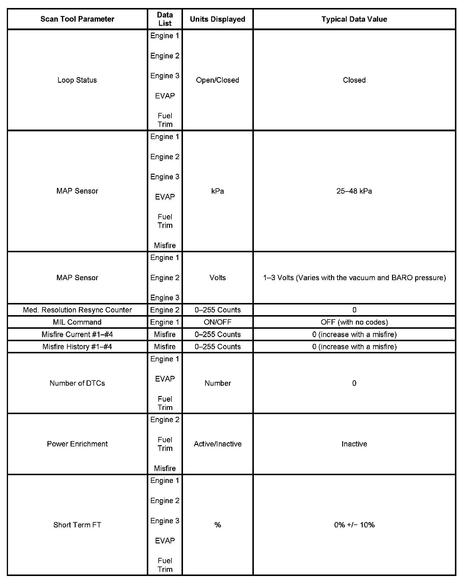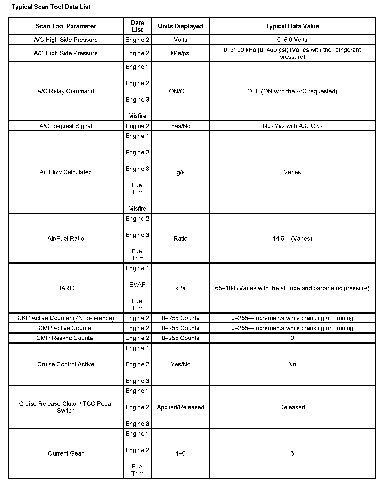 The Engine Scan Tool Data List contains all engine related parameters that are available on the scan tool. The list is arranged in alphabetical order. The parameters in the Typical Scan Data values column represent values that would be seen on a normally running engine.