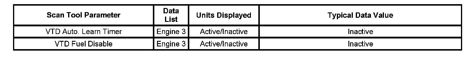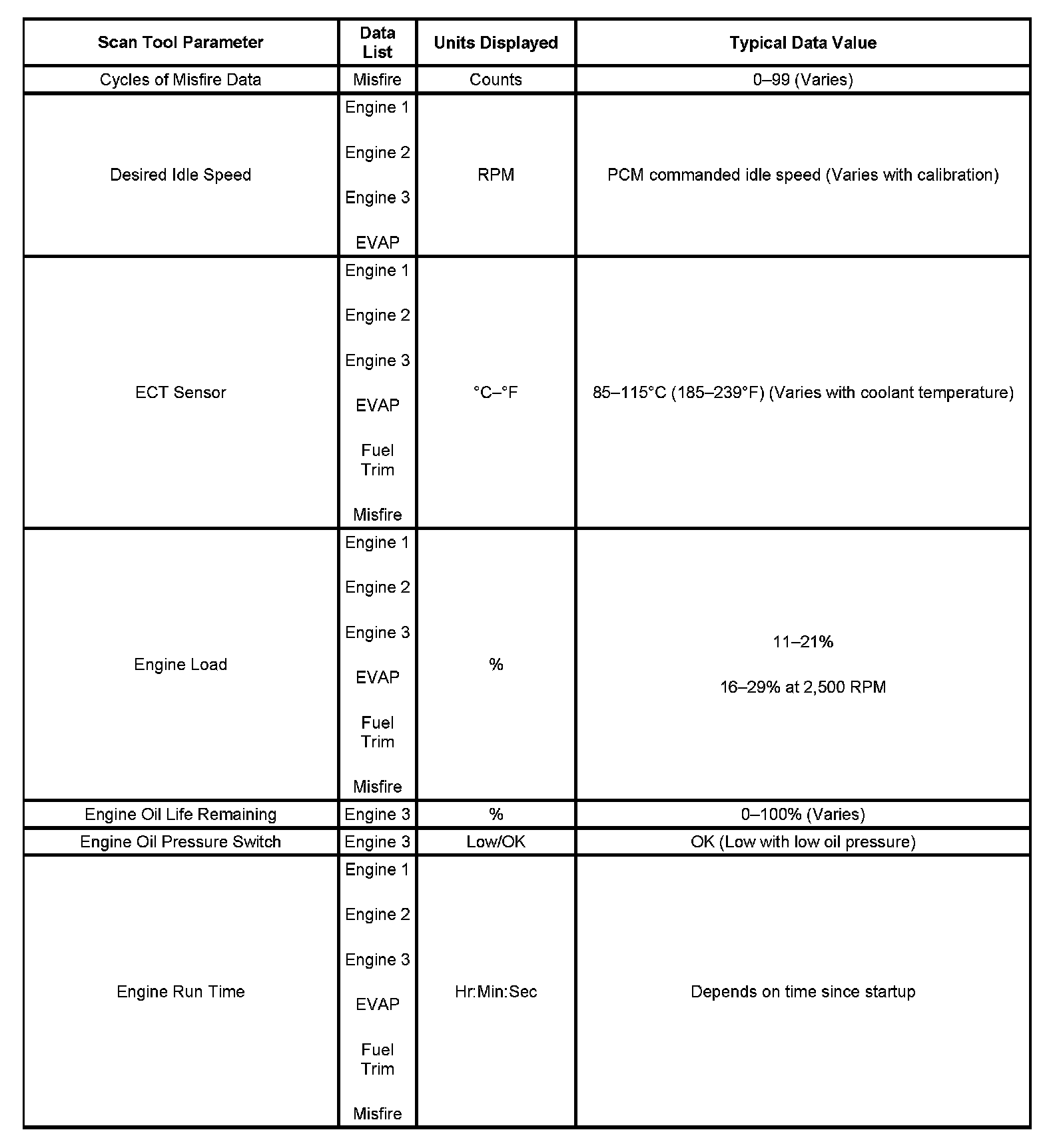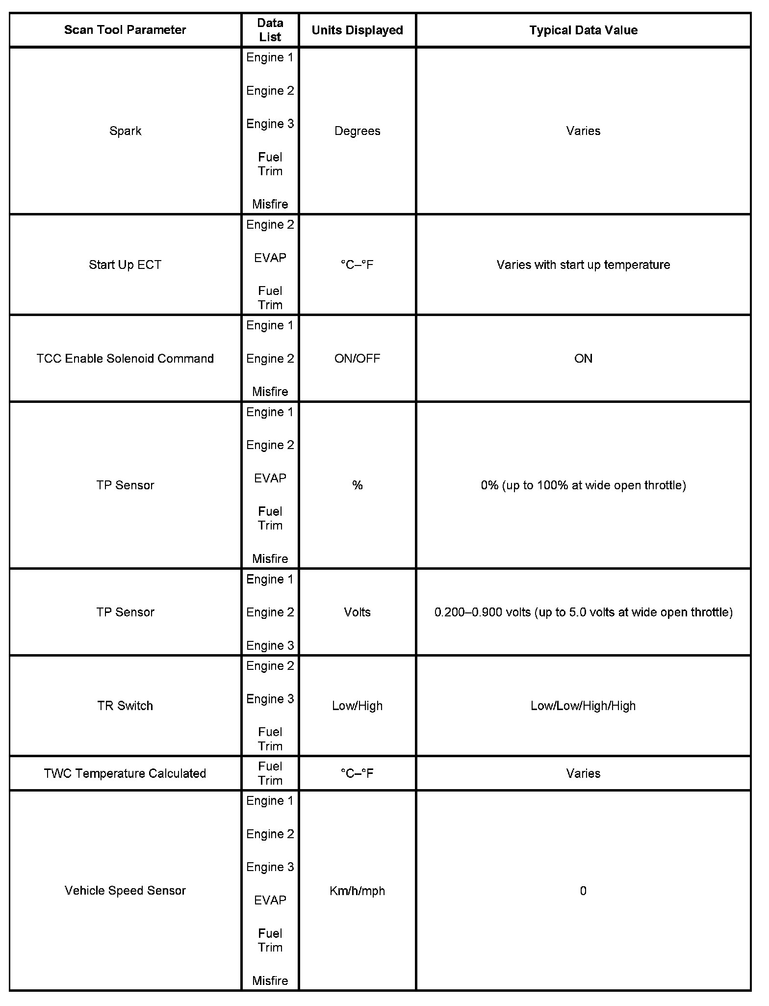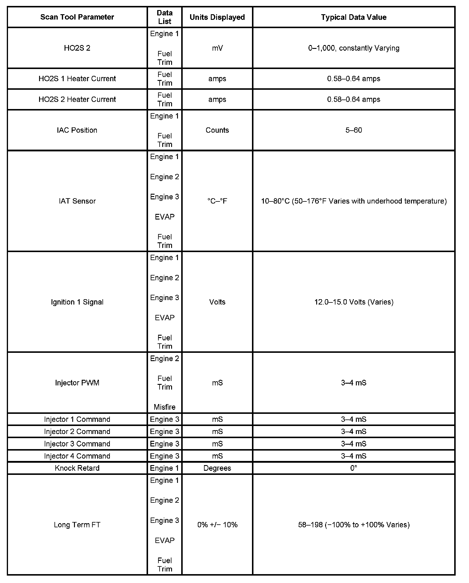 The Engine Scan Tool Data List contains all engine related parameters that are available on the scan tool. The list is arranged in alphabetical order. The parameters in the Typical Scan Data values column represent values that would be seen on a normally running engine.