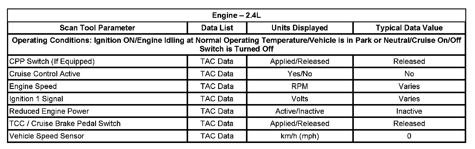 The scan tool data lists contain all of the cruise control related parameters that are available on the scan tool. The parameters in the list are arranged in alphabetical order. The data list column indicates the location of the parameter within the scan tool menu selections.