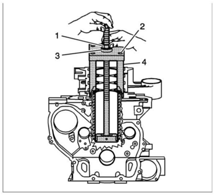9. Install the EN 456850-851 fixture (4) onto the threaded shaft of the EN 456850-852 cylinder bore sleeve puller and the engine block.