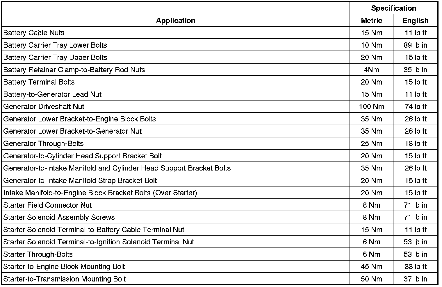 Starting and Charging: Specifications