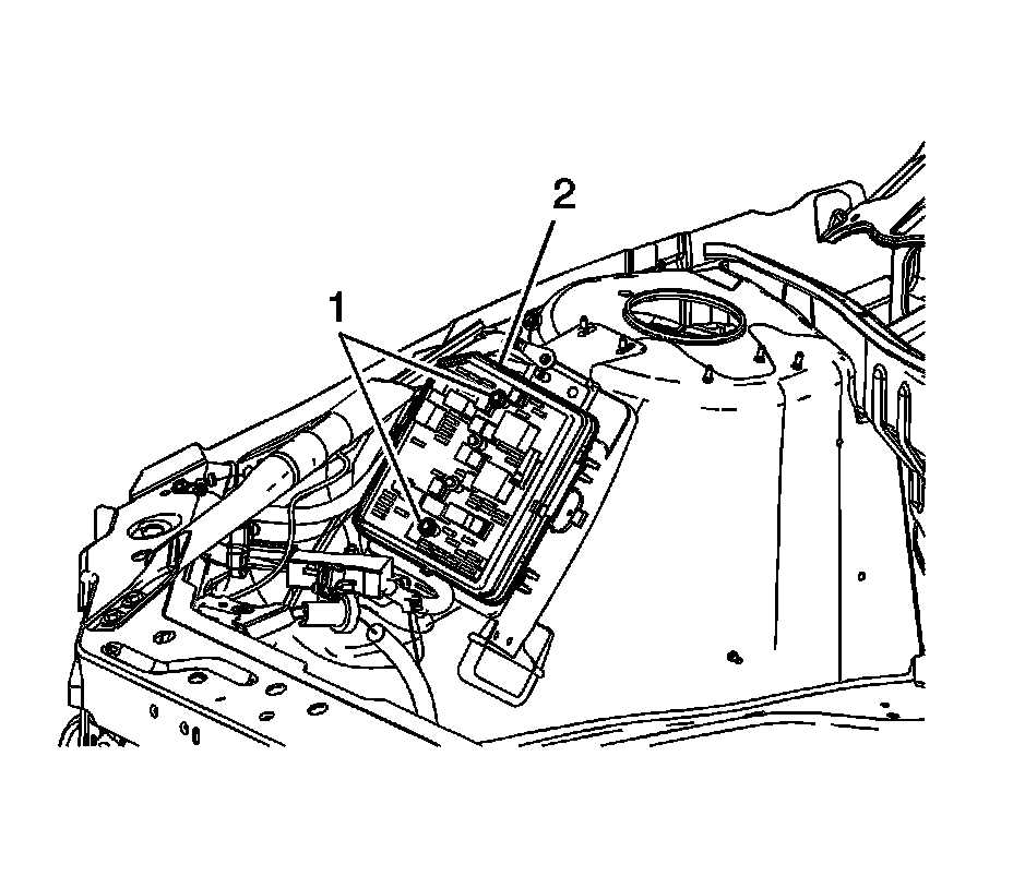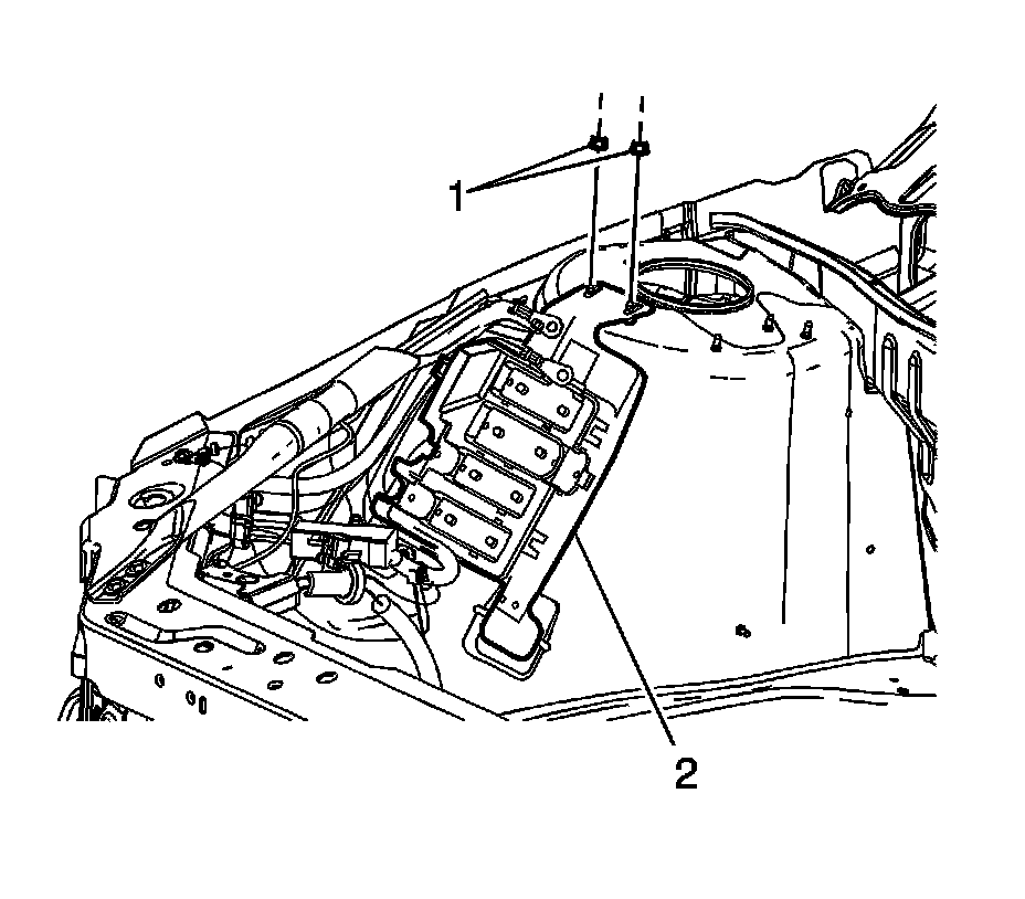 6. Remove the fasteners (1) securing the electrical center bracket (2) to vehicle.
