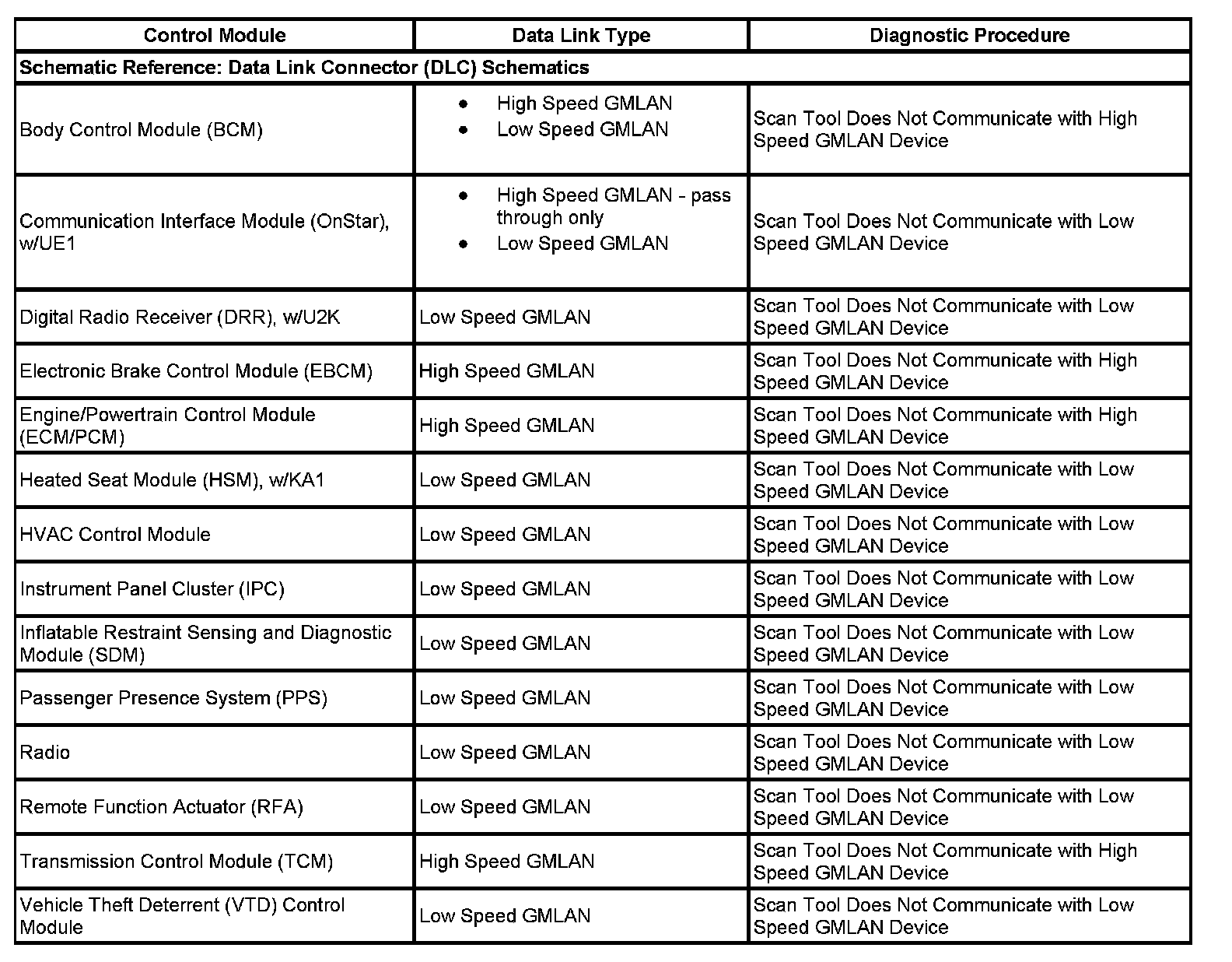 This table identifies which serial data link that a particular module uses for in-vehicle data transmission. Some modules may use more than one data link to communicate. Some modules may have multiple communication circuits passing through them without actively communicating on that data link. This table is used to assist in correcting a communication malfunction. For the description and operation of these serial data communication circuits refer to Data Link Communications Description and Operation.