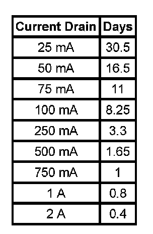 - The graph indicates roughly how many days a 690 CCA battery with at 110 min. RC (60.5 AH) starting at 80 percent state of charge will last with a constant current draw until it reaches 50 percent state of charge. Differences in battery temperature and ratings will affect the results:
