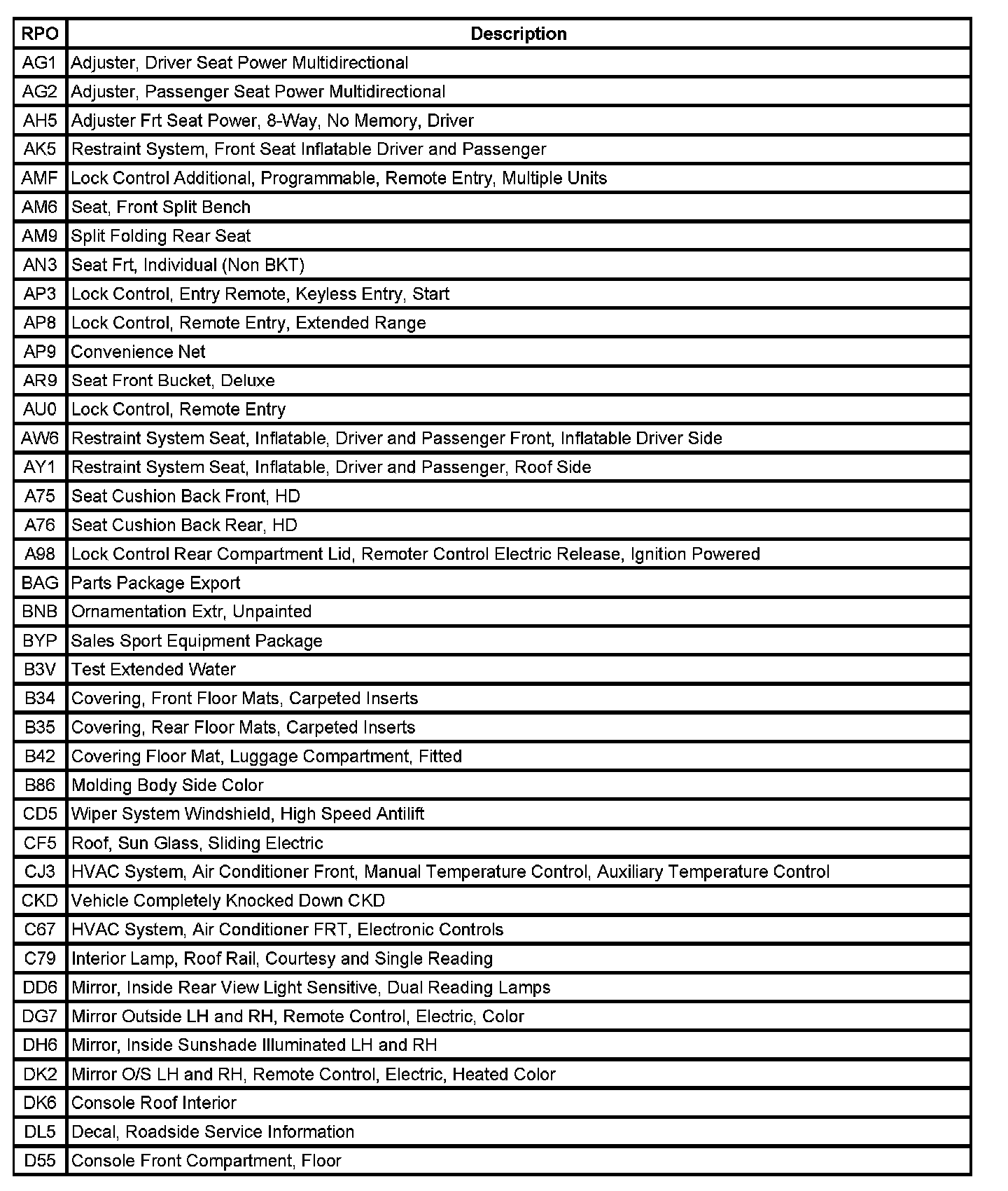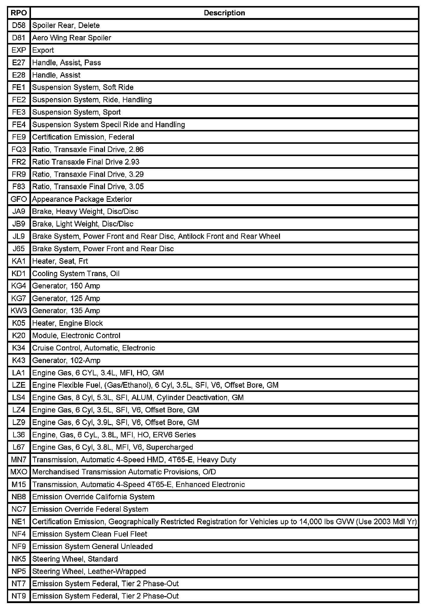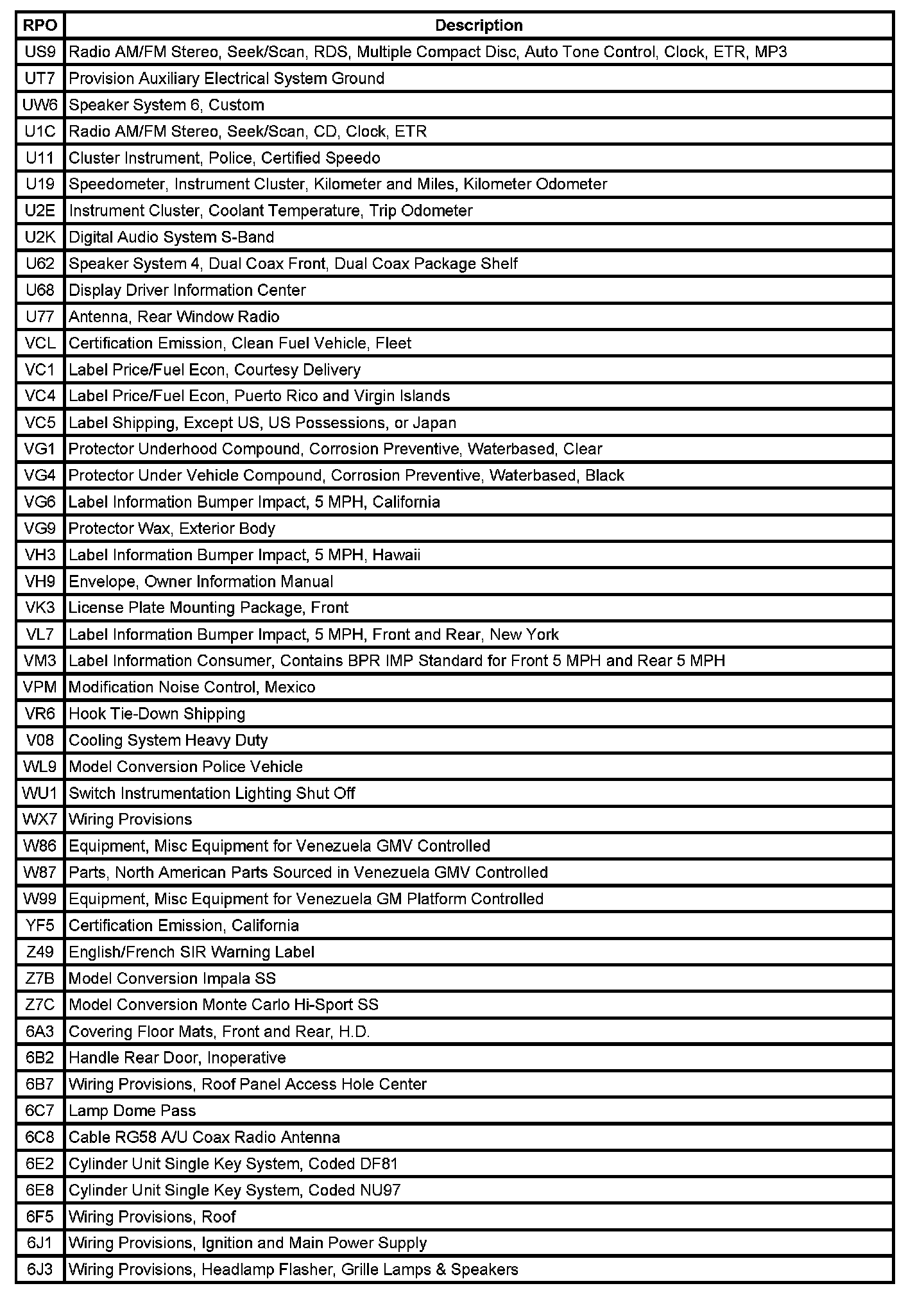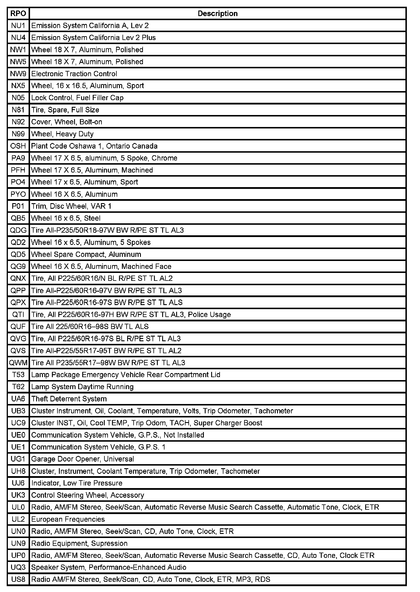 The table provides the description of the Regular Production Option (RPO) codes that are available on the vehicle. The vehicle's RPO list is printed on the Service Parts Identification Label.