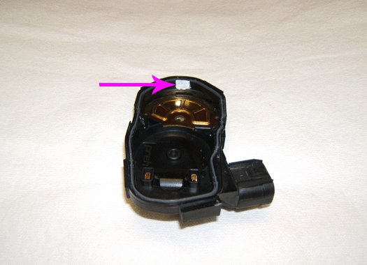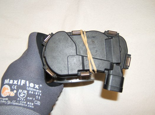 10. Hold the throttle body with your hand, so that the TP sensor cover is facing upward. Remove the rubber band securing the TP sensor cover. Grasp the TP sensor cover and carefully lift it straight up and separate it from the throttle body.