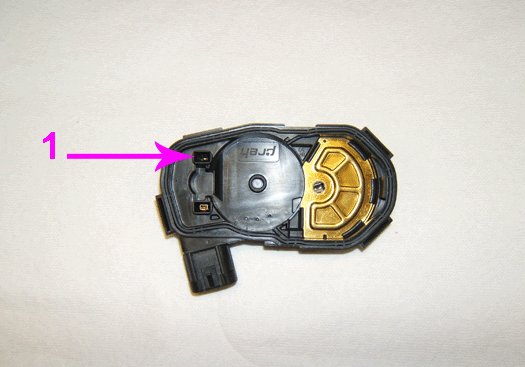 13. Observe the TP sensor cover for missing female throttle actuator motor terminals (1). Verify that the female throttle actuator motor terminals have remained in the TP sensor cover and have not been retained on the throttle actuator motor male terminals as shown. Discard the old TP sensor cover, gasket and terminals.