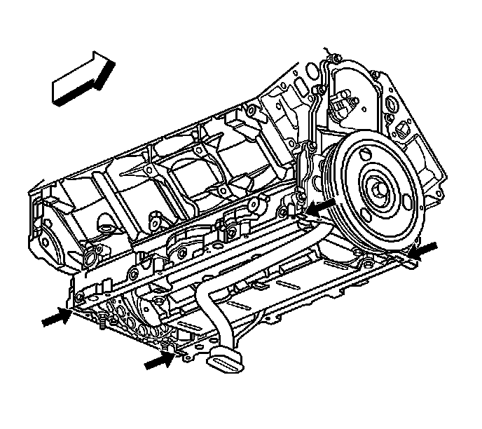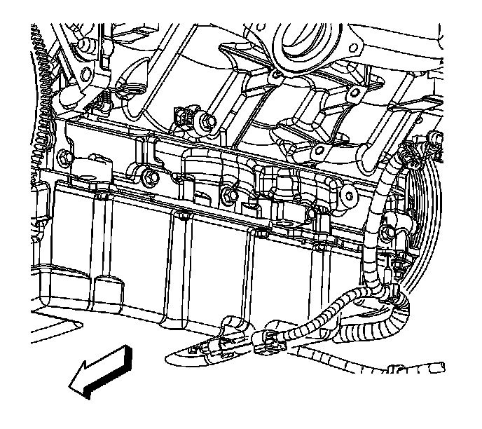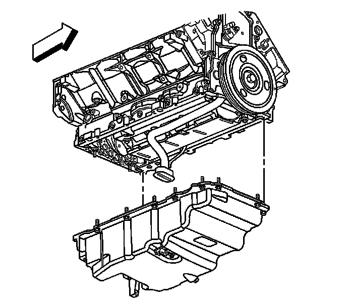 1. Apply a 5 mm (0.20 inch) bead of sealant GM P/N 12346141 or 12378577 (Canadian P/N 89022195), or equivalent 20 mm (0.80 inch) long to the engine block. Apply the sealant directly onto the tabs of the front/rear cover gasket that protrudes into the oil pan surface.