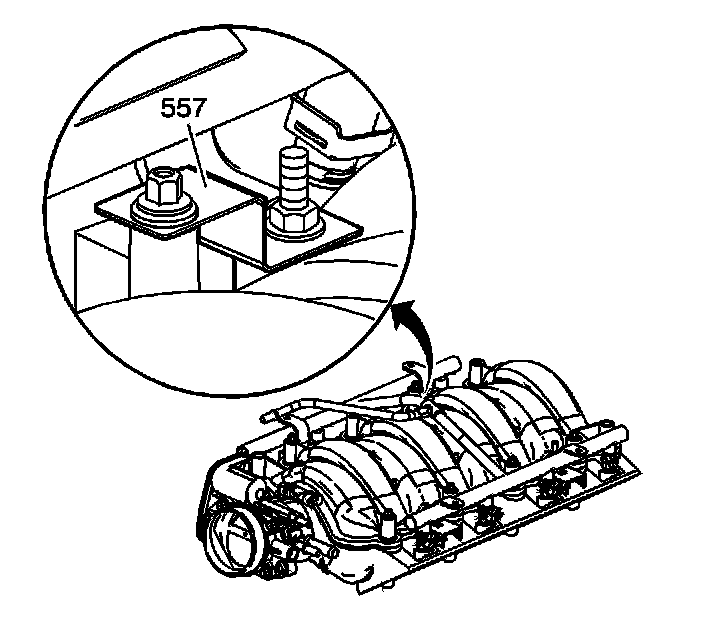 1. Note the installed location of the fuel rail ground strap (557).