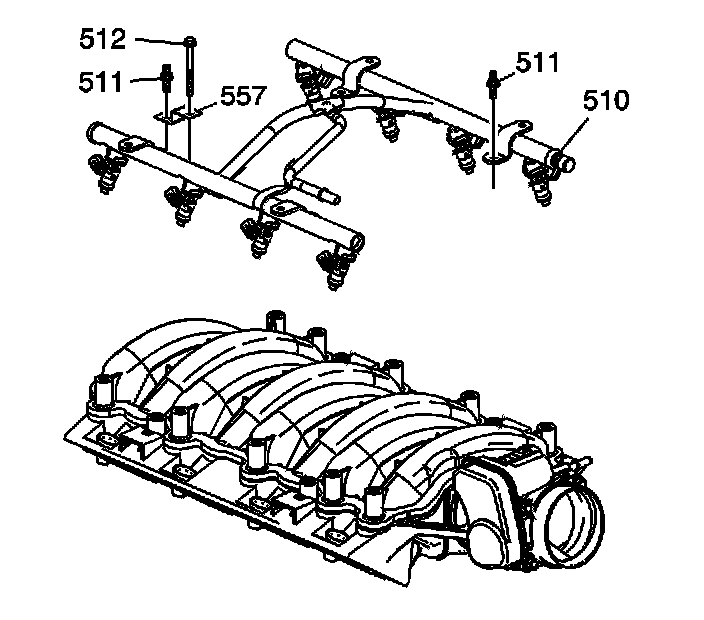 5. Install the fuel rail (510) with injectors. Push firmly on both sides of the rail until all the injectors have been seated into their bores.