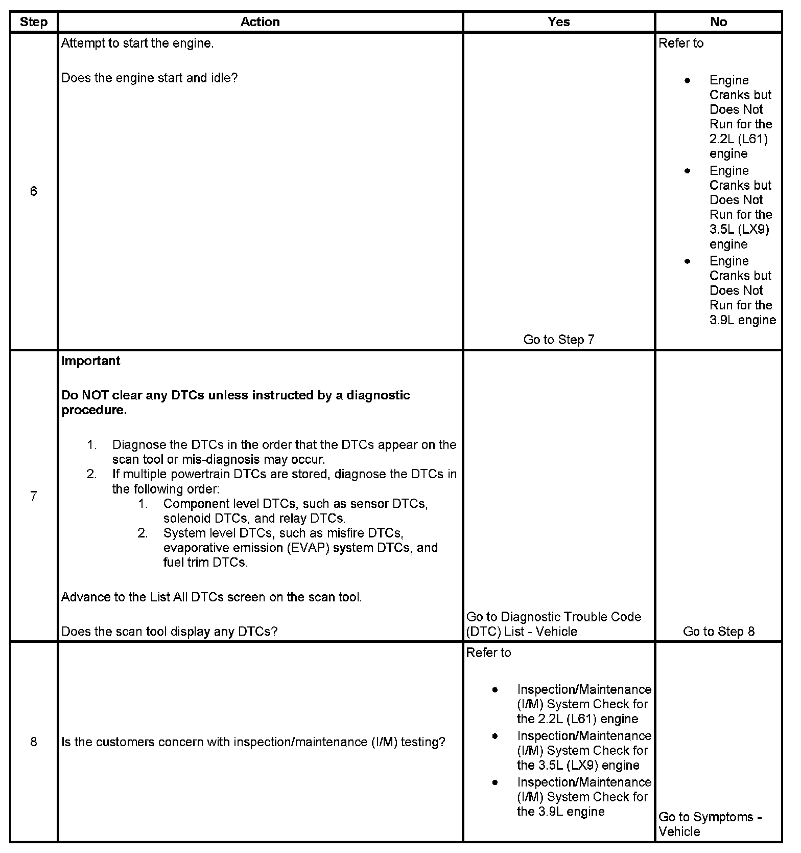 The numbers below refer to the step numbers on the diagnostic table.
