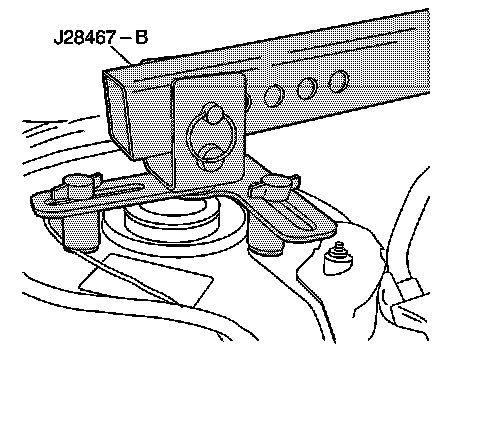 19. Place the rubber padded foot of the J28467-4A front support assembly on the vehicle radiator shelf. The foot position used in the J28467-4A front support assembly depends on the vehicle application.