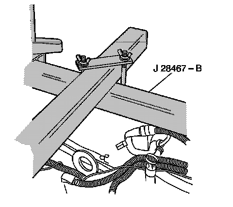 16. Adjust the J28467-2A radiator shelf tube and the J28467-6A assemblage lift hook bracket in order to align the hook with the left (front), rear of engine, lift hook bracket part of the left engine mount strut bracket.