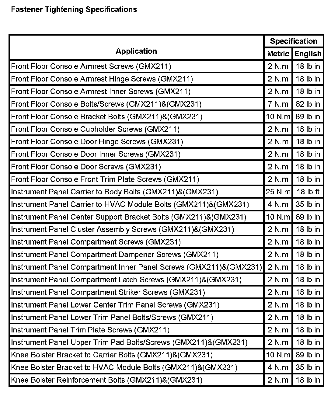 Instrument Panel, Gauges and Warning Indicators: Specifications