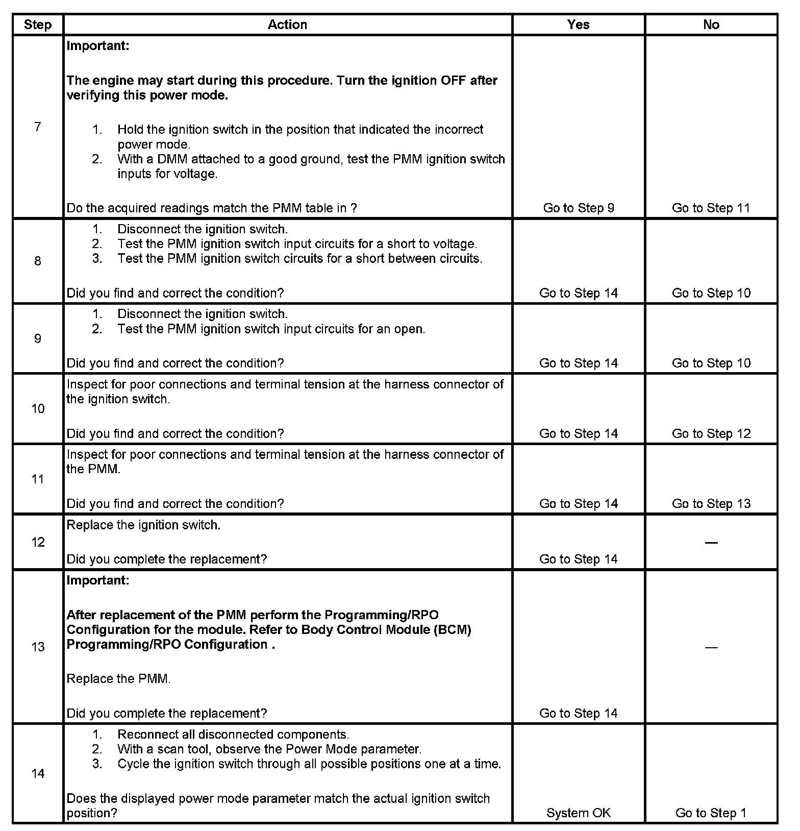 The numbers below refer to the step numbers on the diagnostic table.
