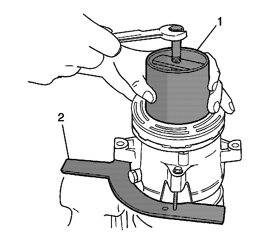 6. With the compressor mounted to the J 34992 (2), install the J 33020 (1) into the inner circle of slots in the pulley rotor. Turn the J 33020 (1) clockwise in the slots to engage the puller tangs with the segments between the slots in the rotor.