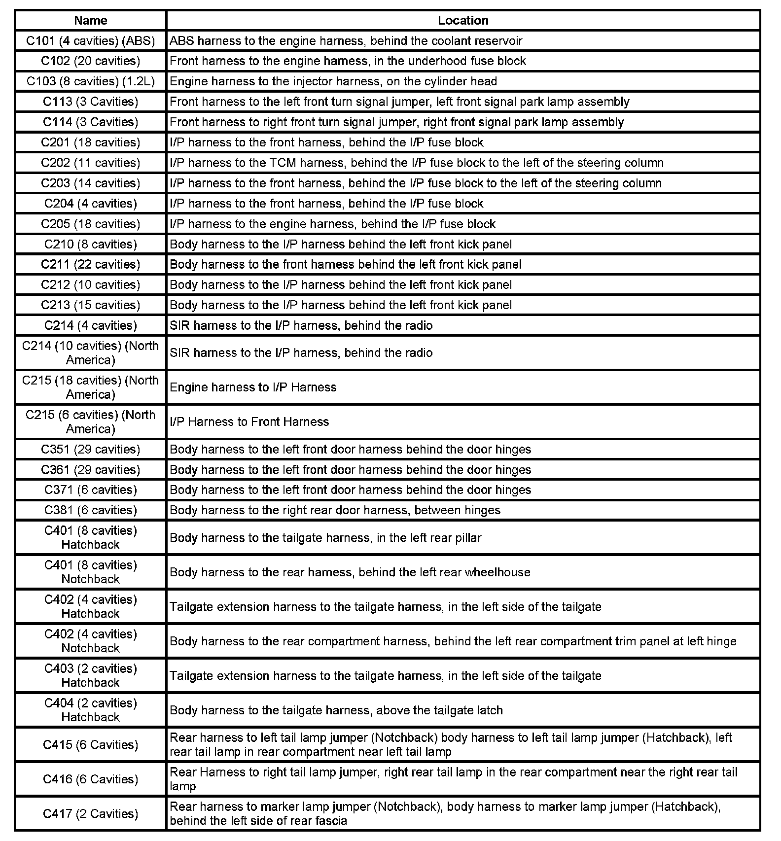 Master Electrical Component List (Hatchback)