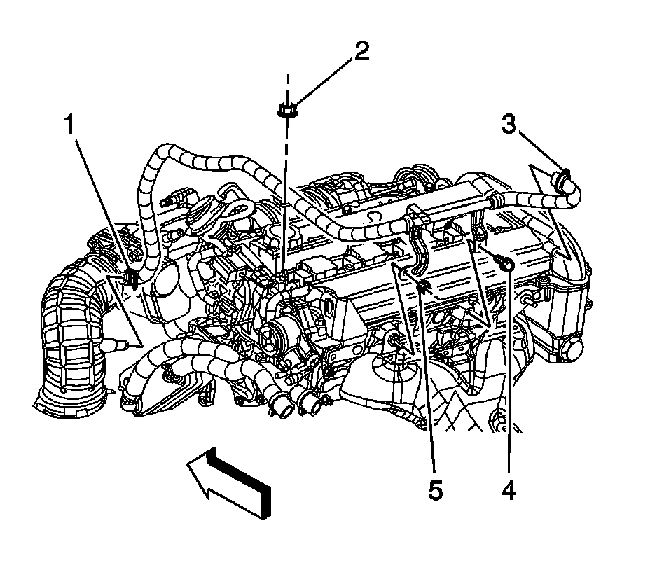 5. Remove the positive crankcase ventilation (PCV) vent tube/hose bolt (4) and nuts (2, 5).