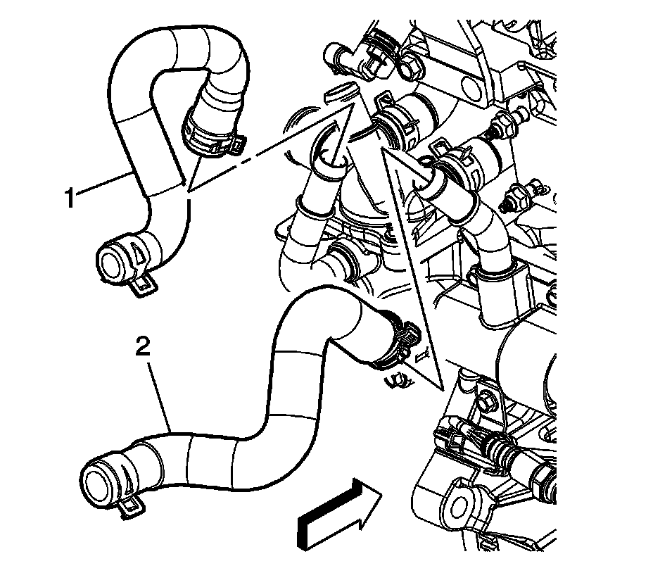 18. Disconnect the heater inlet (1) and outlet (2) hoses from the thermostat housing pipes.
