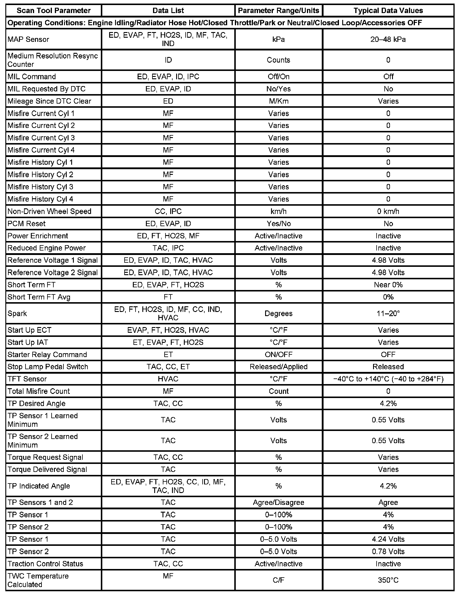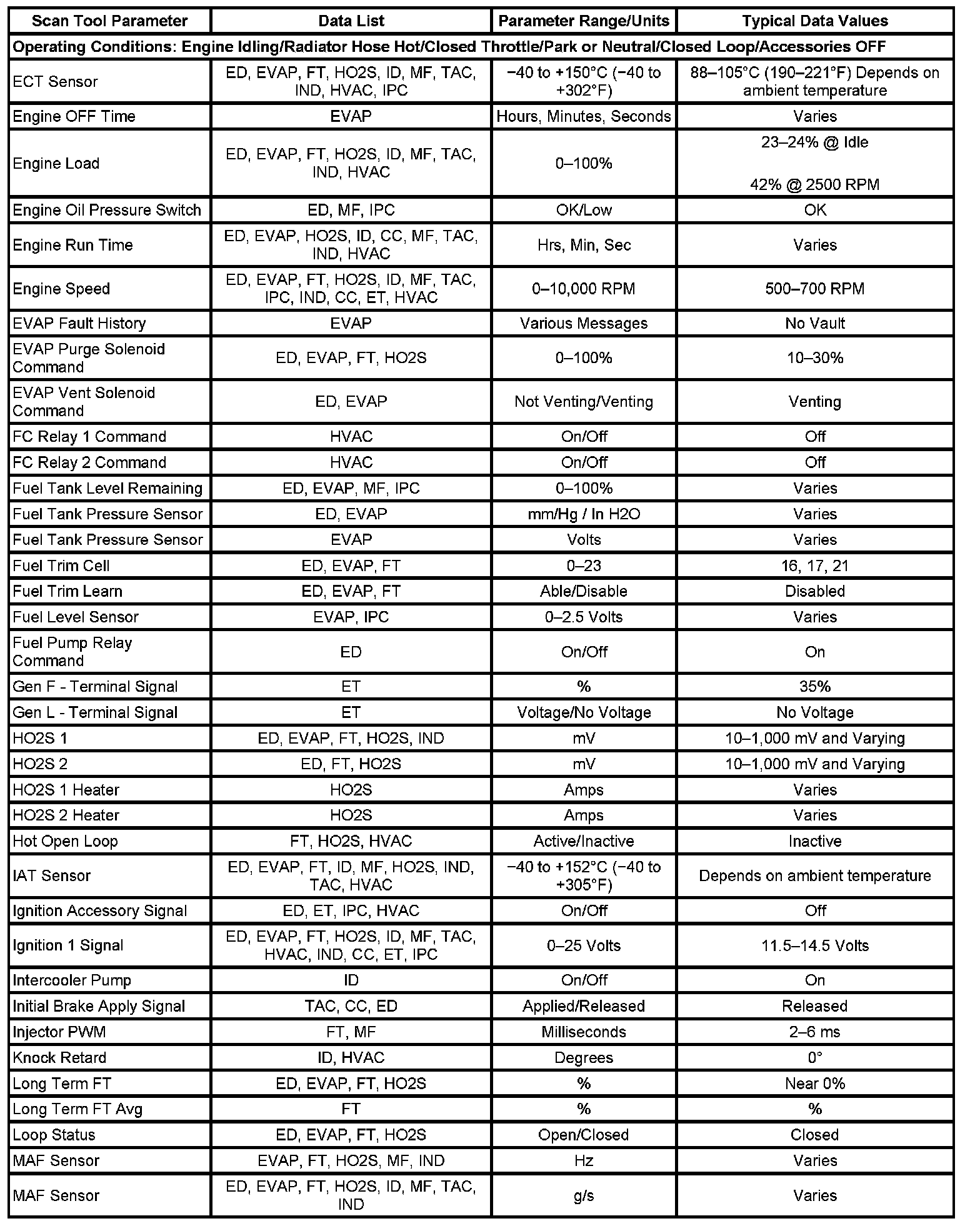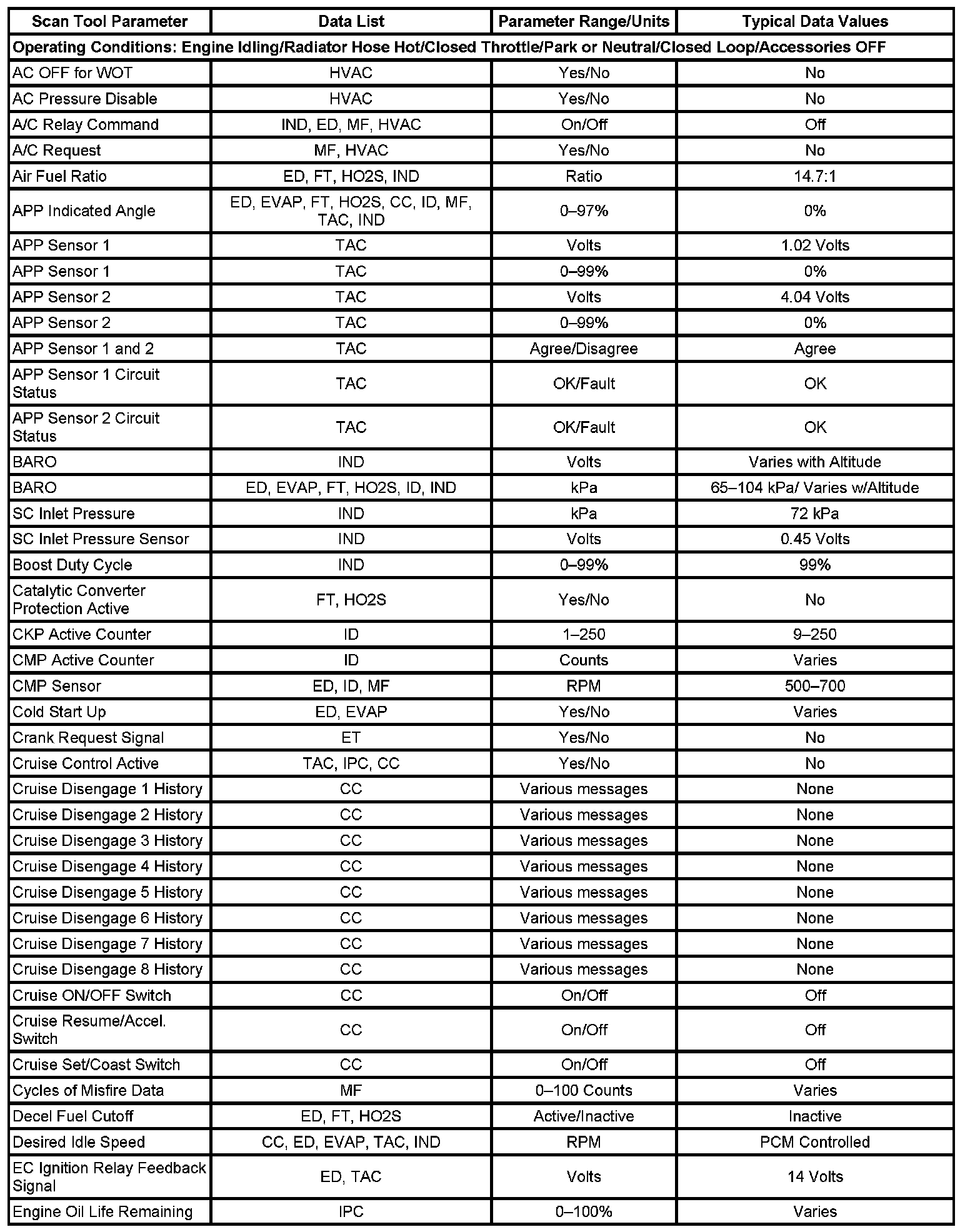 The column labeled Data List indicates where a parameter can be located on the scan tool. Refer to the scan tool operating manual for the exact locations of the data lists. The following is a description of each term listed:
