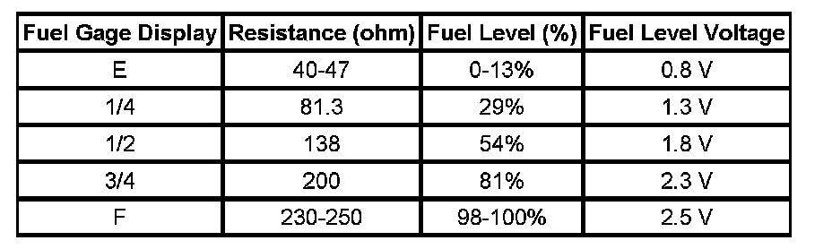 The information in this table is intended for use with the J33431-C Signal Generator and Instrument Panel Tester. The fuel level sensor values represent the test values to be used on the Signal Generator to drive the fuel gage display to the indicated positions. Vehicles that require more than one fuel level sensor calculate gage position from many possible resistance combinations of fuel levels between the two tanks. Therefore, the values in the table may not correlate directly to readings taken from the vehicle primary or secondary sending units.