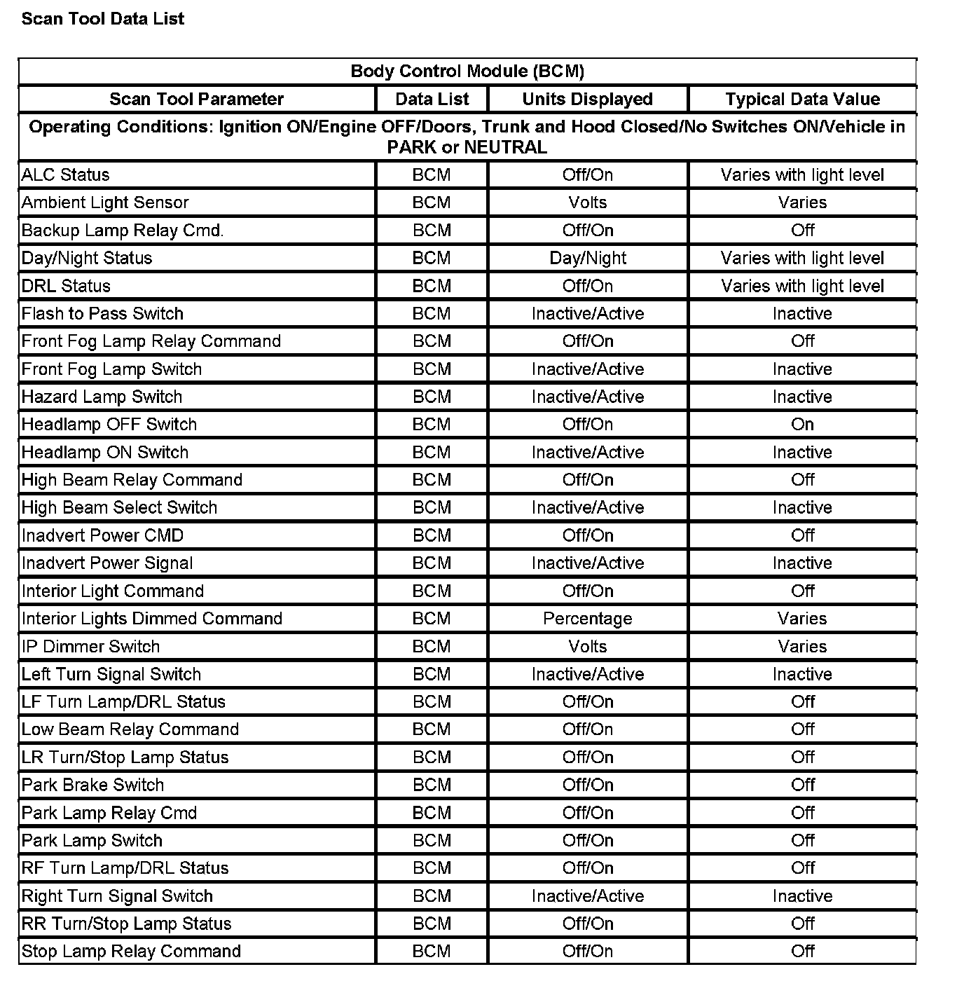Scan Tool Data List: