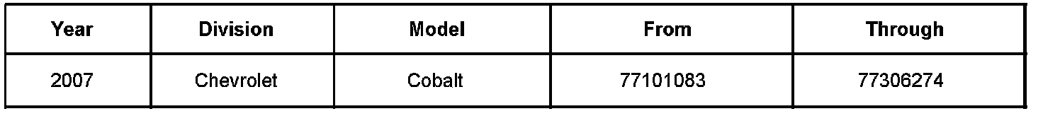 Involved are certain 2007 Chevrolet Cobalt vehicles, equipped with a 4T45E (RPO MN5) automatic transmission and built within the VIN breakpoints shown.