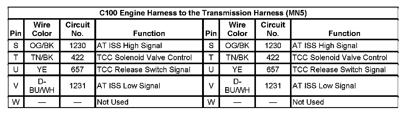 C100 Engine Harness To The Transmission Harness (With RPO Code MN5) (Pin S To W):