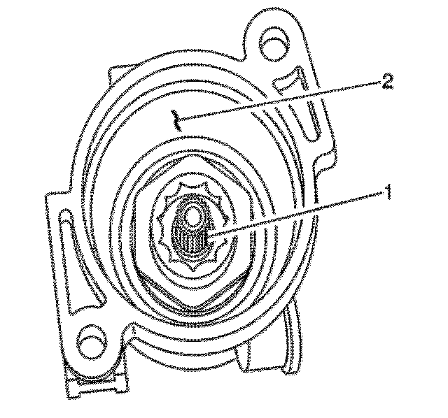 9. Use a lint free cotton cloth or equivalent in order to remove all remaining lubricant from the steering column worm shaft spline (1) and the steering column housing (2).