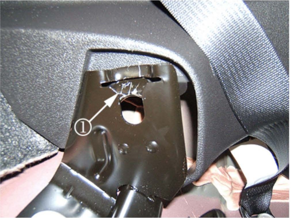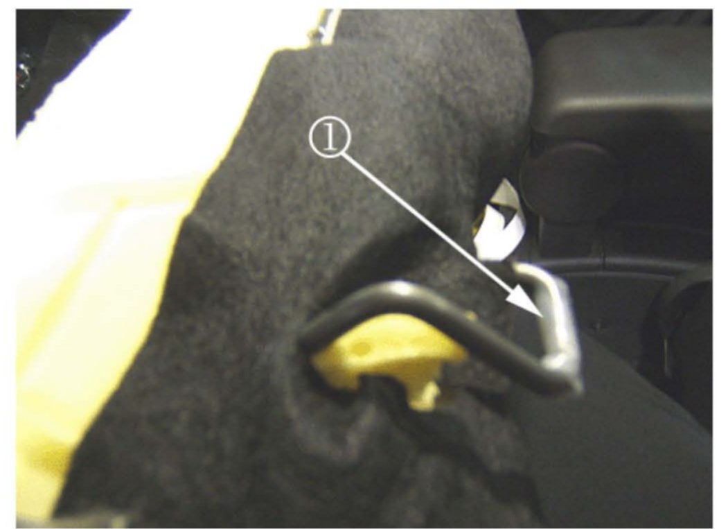 Inspect the two rear seat cushion retaining hooks for a witness mark (1). The hooks may be contacting the bracket. Continue to test drive the vehicle.