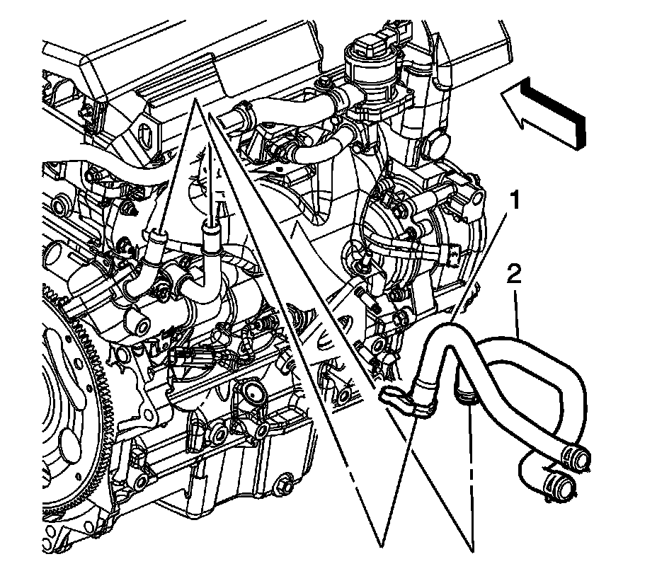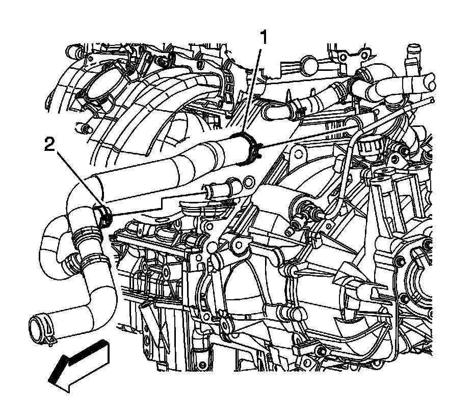 20. Disconnect the heater inlet (2) and outlet (1) hoses from the thermostat housing pipes.