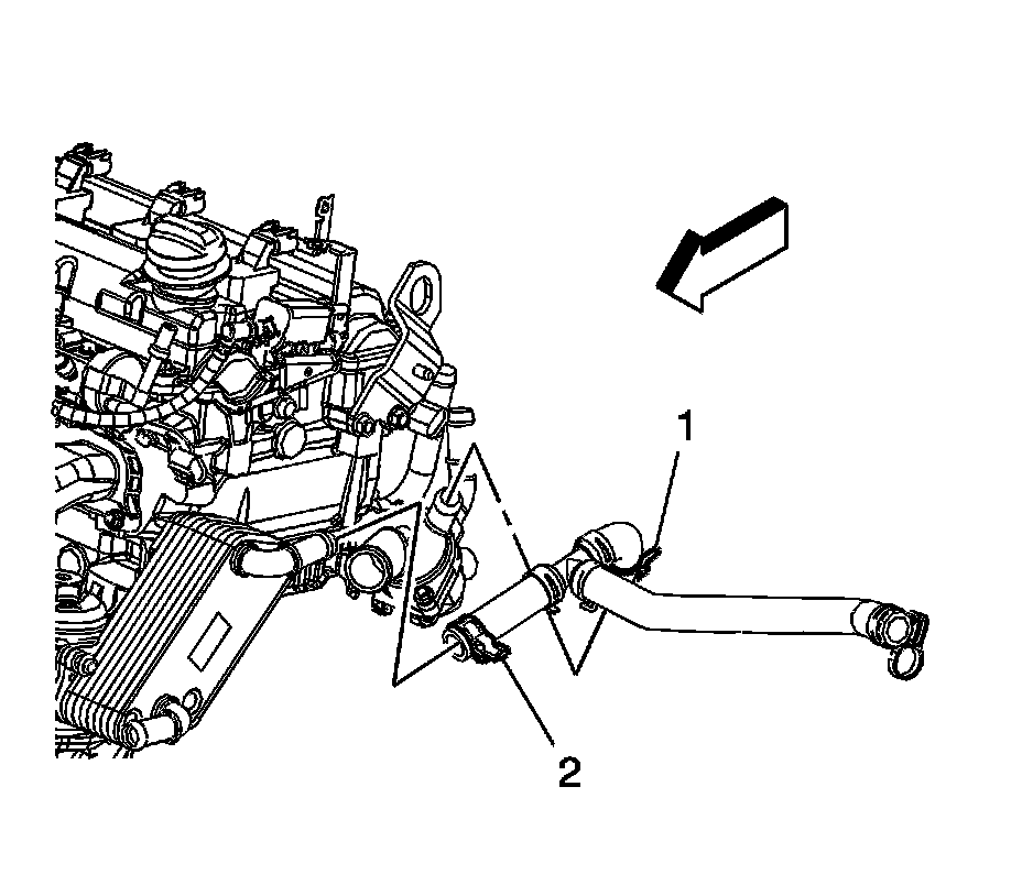 11. Reposition the radiator surge tank outlet hose clamp (2) at the oil cooler.
