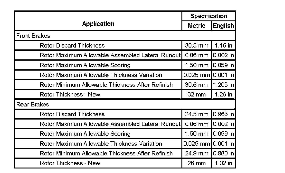 Disc Brake Component Specifications: