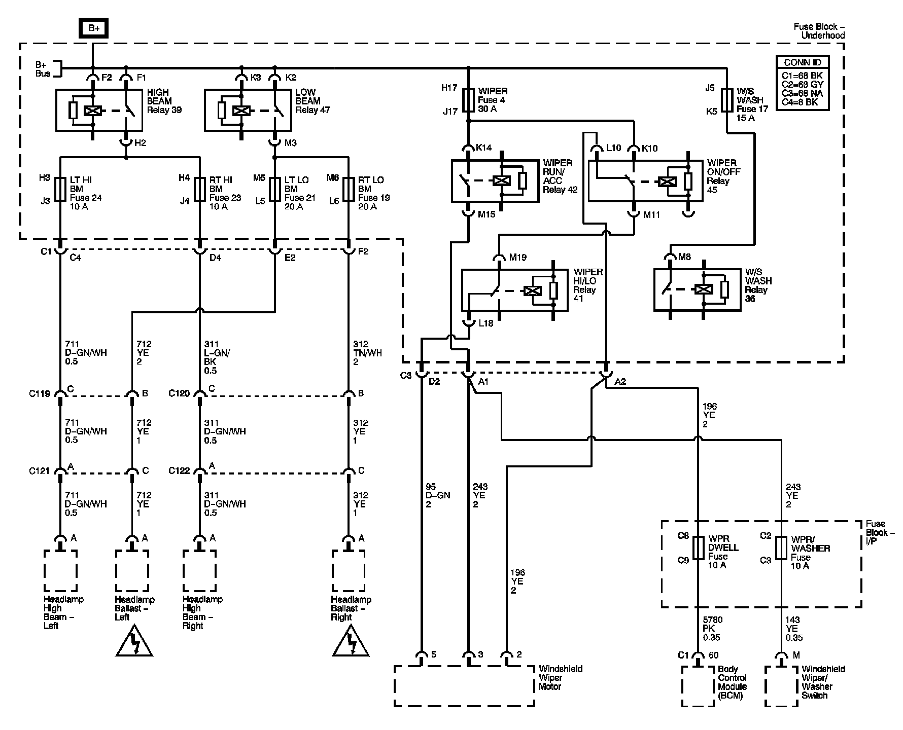Fuse Block - Underhood LT HI BM, LT LO BM, RT HI BM, RT LO BM, WIPER, and W/S WASH Fuses, HIGH BEAM, LOW BEAM, WIPER HI/LO, WIPER ON/OFF, WIPER RUN/ACC and W/S WASH Relays, Fuse Block - I/P WPR DWELL and WPR/WASHER